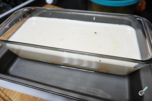 Pegue uma forma um pouco maior que a flan e coloque a fôrma dentro. Adicione a mistura do Flan na forma com o caramelo, vá acrescentando aos poucos para não misturar com o caramelo. Despeje dois dedos de água quente na bandeja grande para cozinhar o Flan em banho-maria.