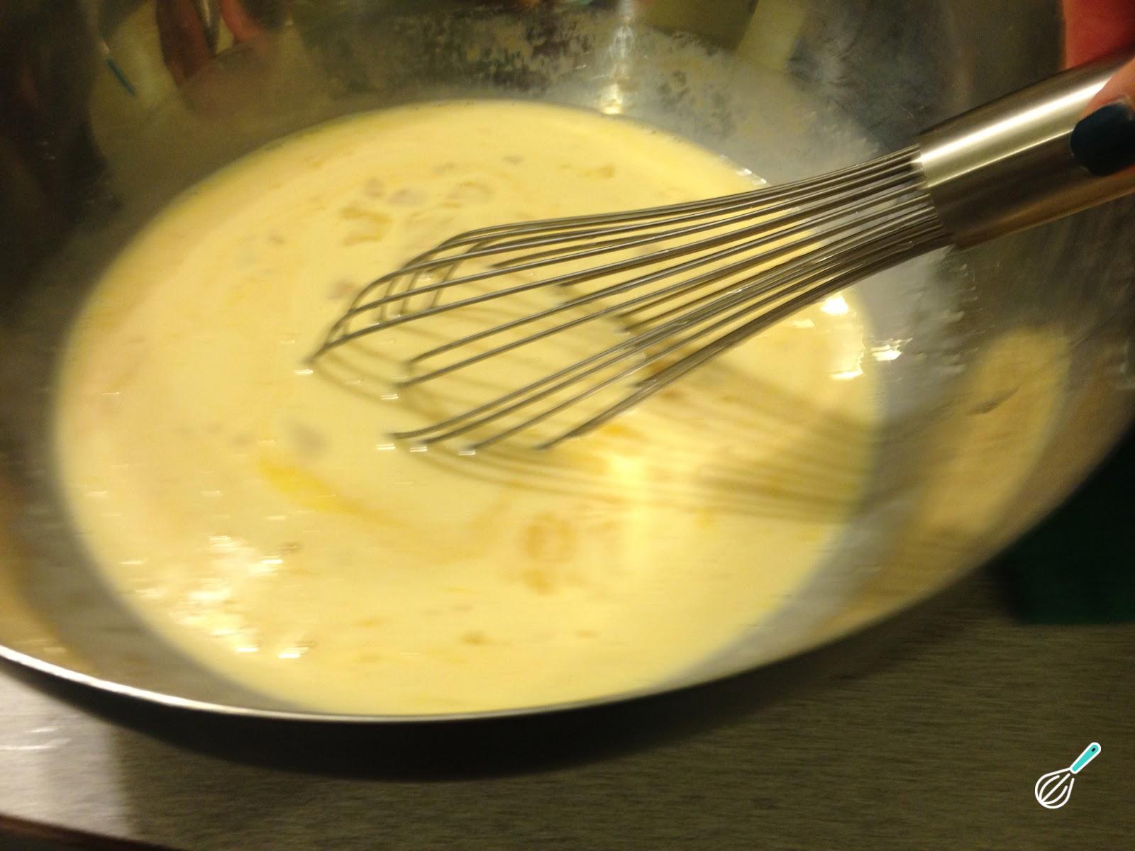 Separadamente, bata os 8 ovos. Adicione o leite, as 200 g de açúcar restantes e a essência de baunilha a gosto. Bata bem para que o seu flan simples não fique com grumos.