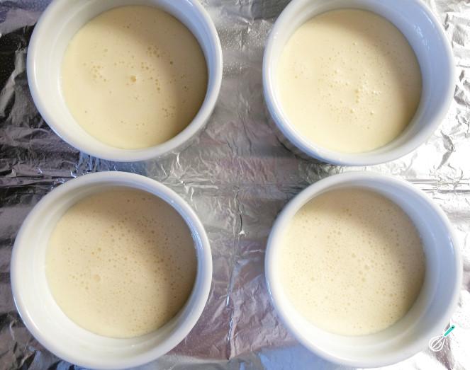Assim que o caramelo solidificar e a mistura esteja pronta, despeje-a na forma ou distribua pelas forminhas individuais. Em seguida, asse o flan rápido por cerca de 30 minutos a 180 º C.
