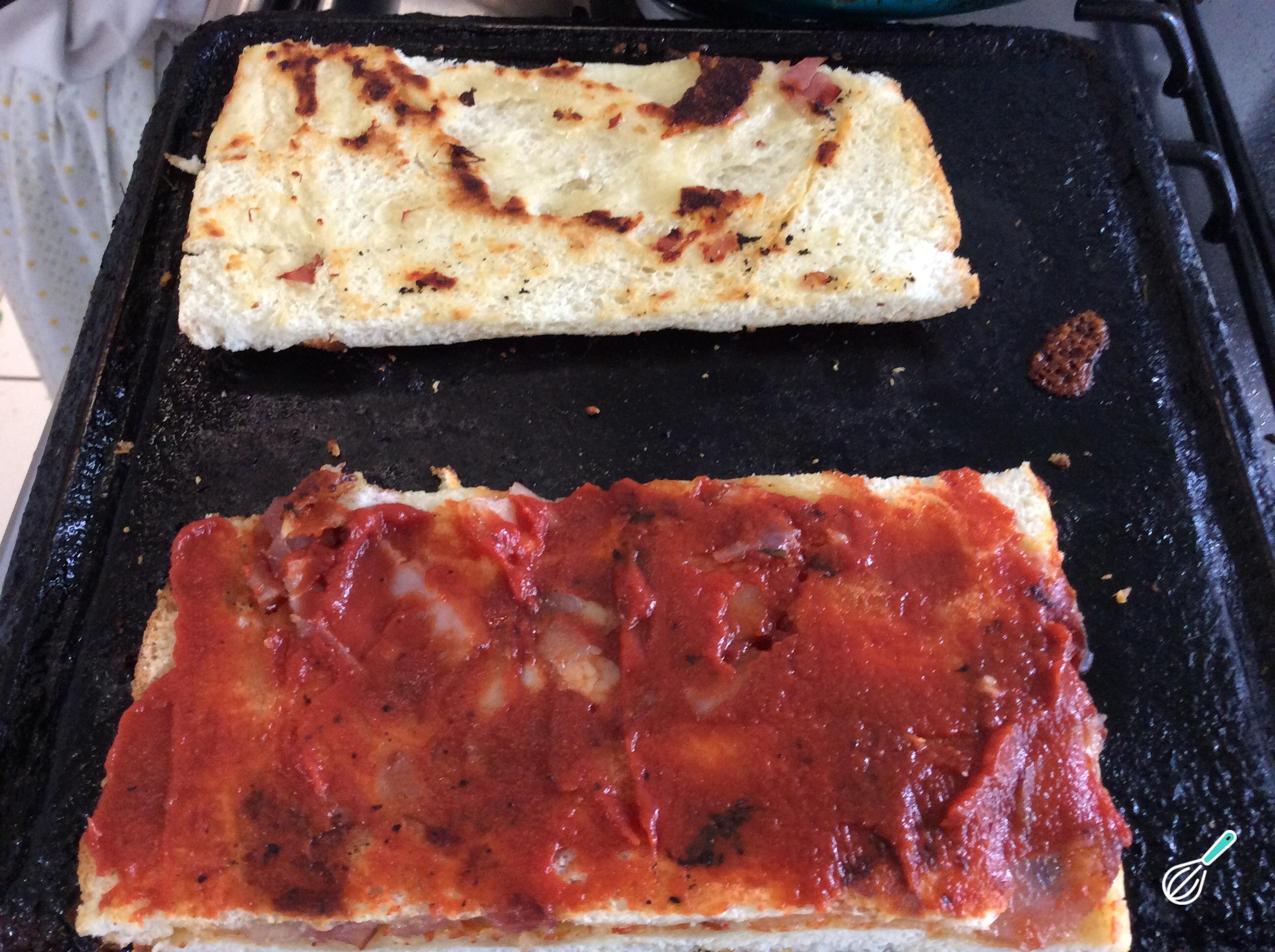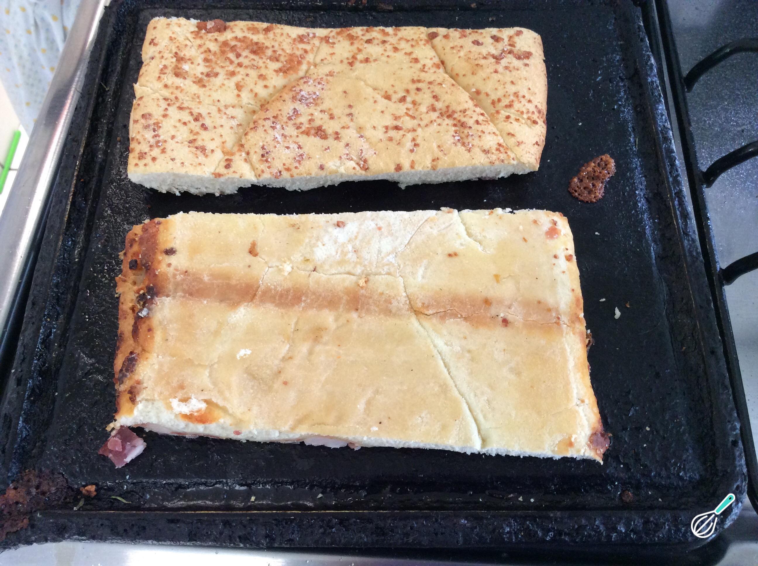Corte o pão focaccia ao meio e doure numa grelha ou frigideira com um pouco de gordura.