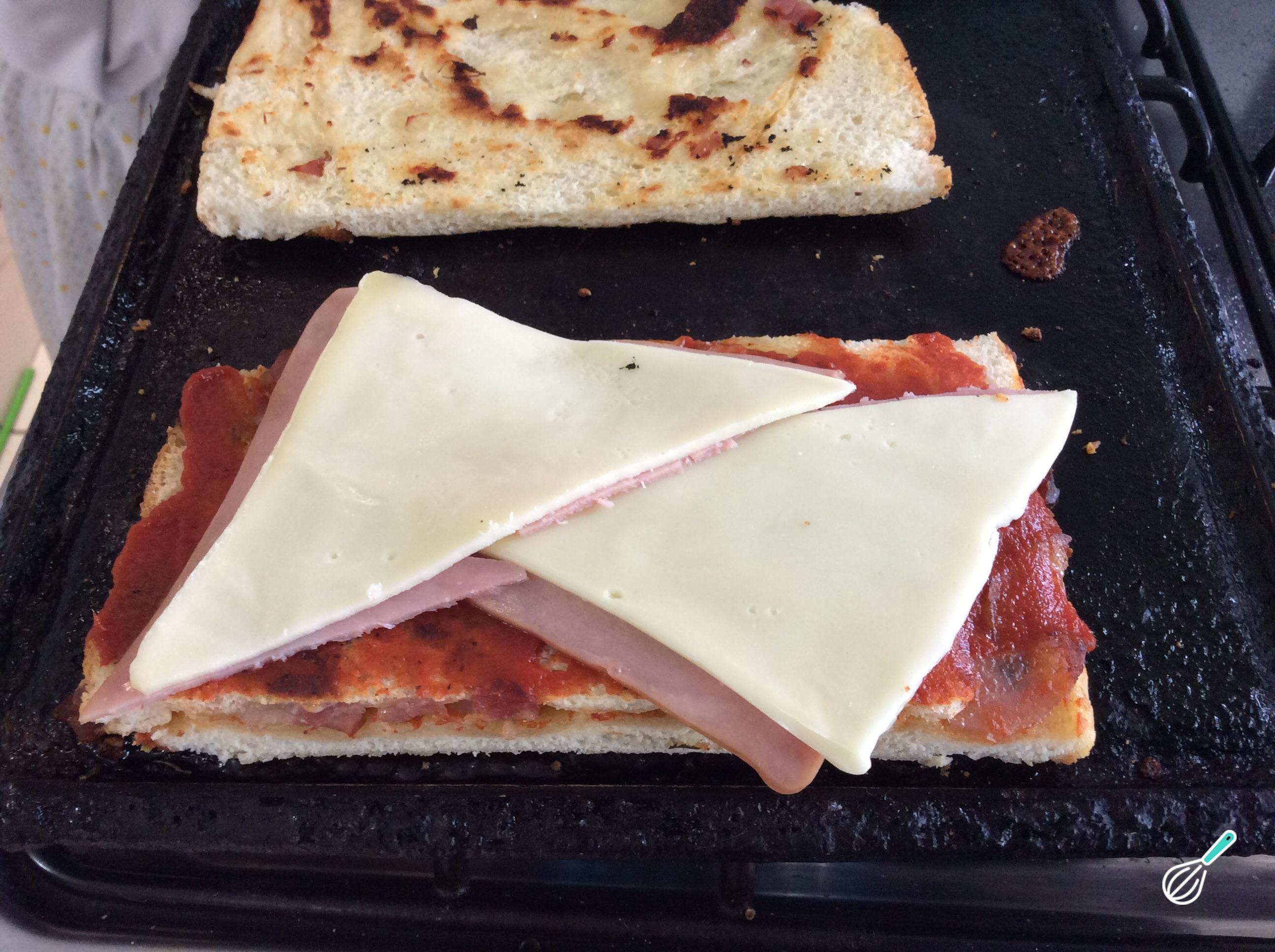 Disponha nelas as fatias de queijo e de presunto e deixe ficar um pouco mais na grelha ou frigideira, para que derreta ligeiramente.
