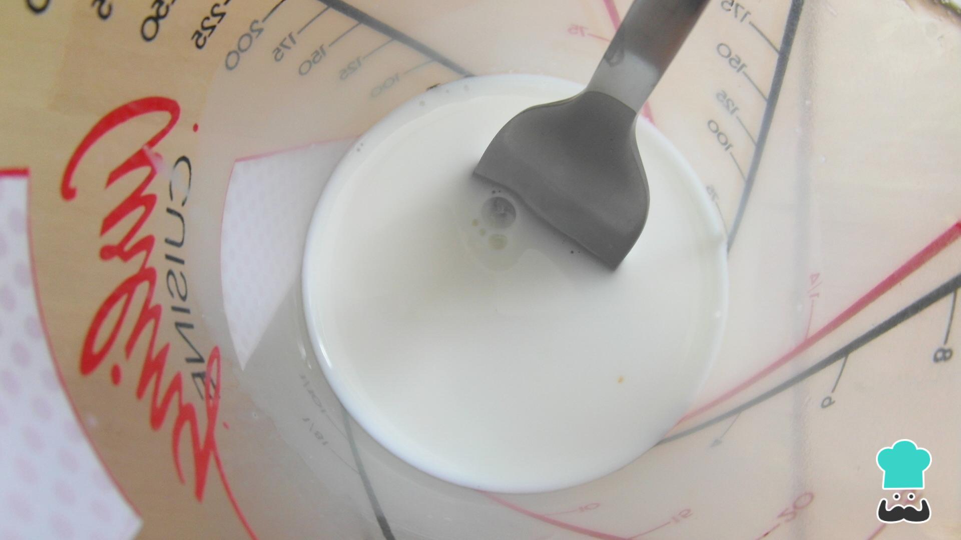 O primeiro passo desta receita de folar de Páscoa português é dissolver o fermento no leite.