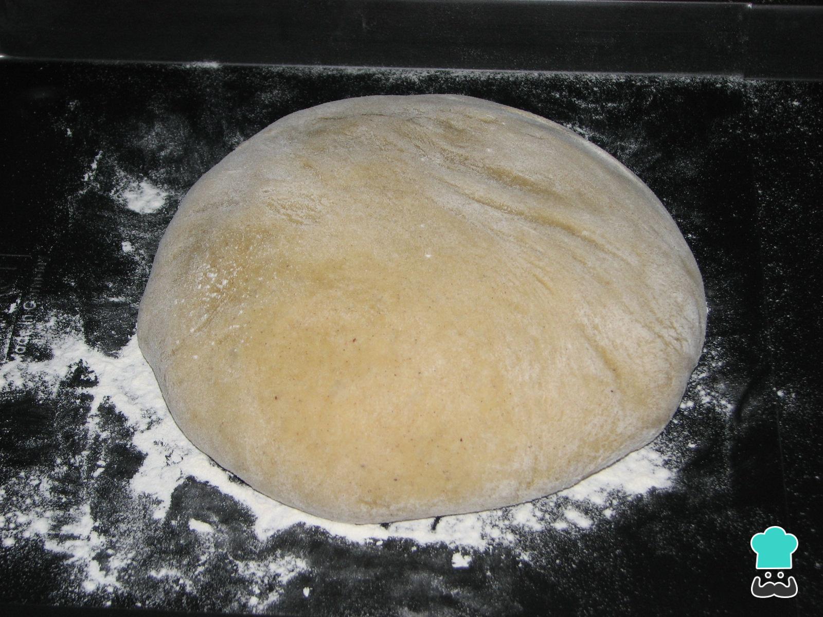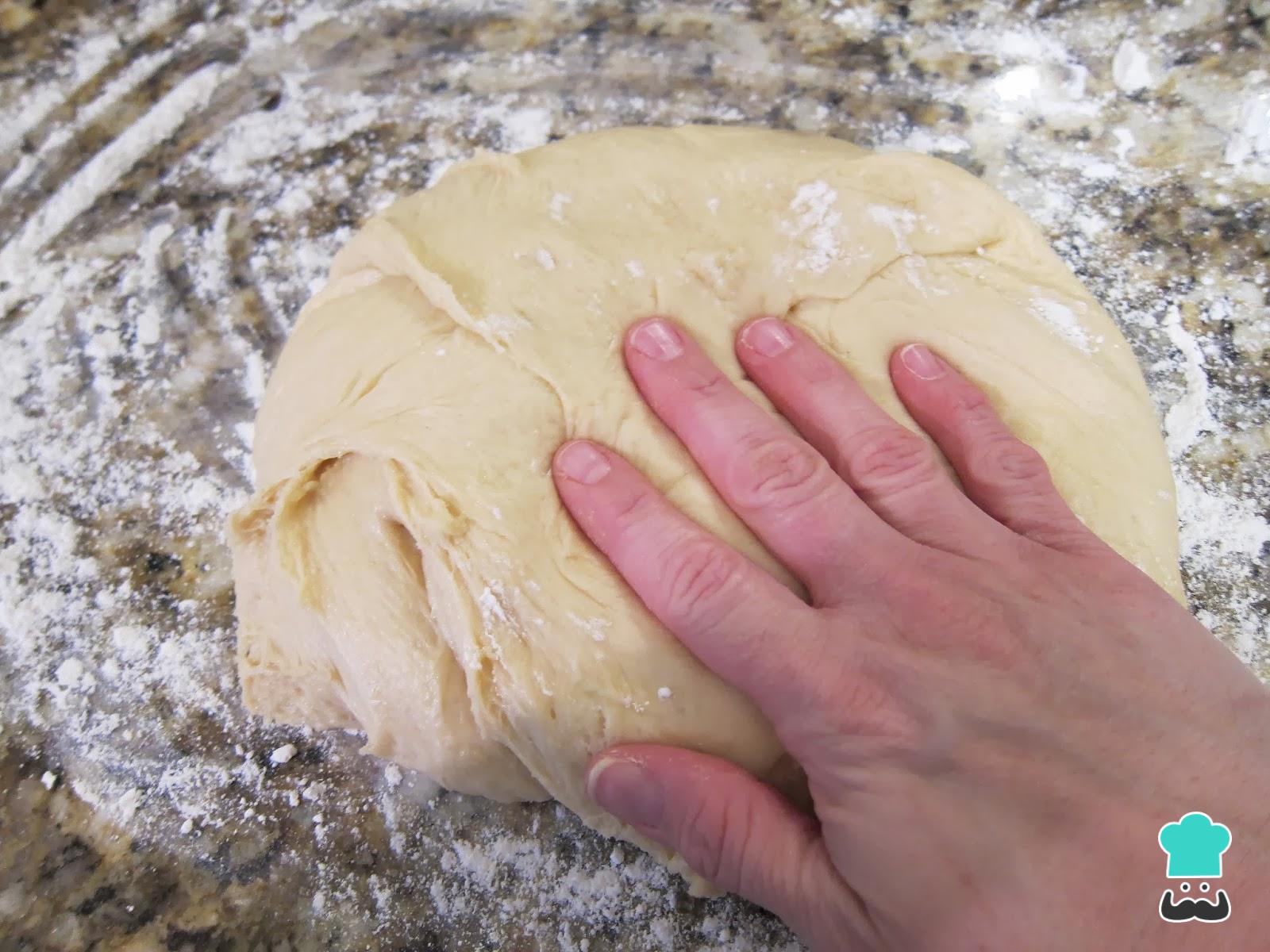 Polvilhe uma superfície de trabalho com farinha e verta aí a massa levedada. Polvilhe com farinha e sove com as mãos, até já não grudar (poderá ser necessário adicionar mais farinha).