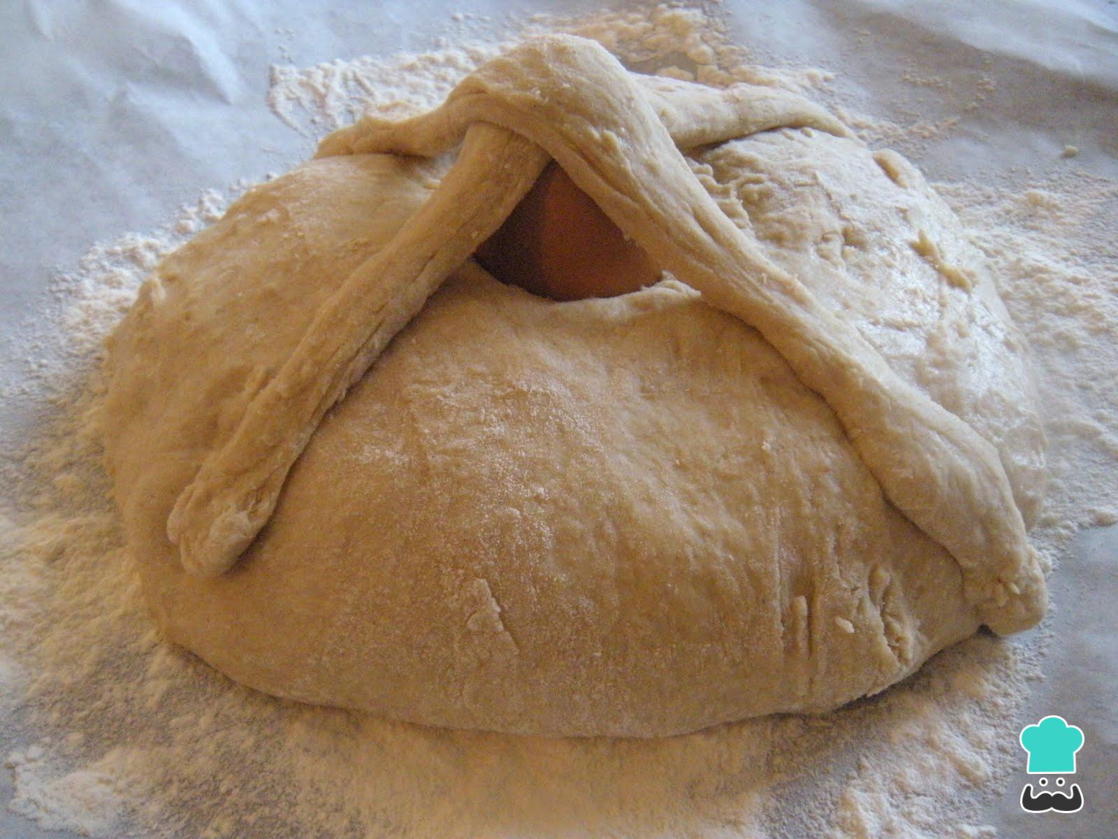 Monte o folar de Páscoa: separe 1/3 da massa e, com ela, modele 2 rolinhos. Modele a outra massa em forma achatada (adicione mais farinha) e coloque num tabuleiro untado e enfarinhado. Afunde o ovo cozido ao centro, e coloque os rolinhos em forma de X sobre o ovo.