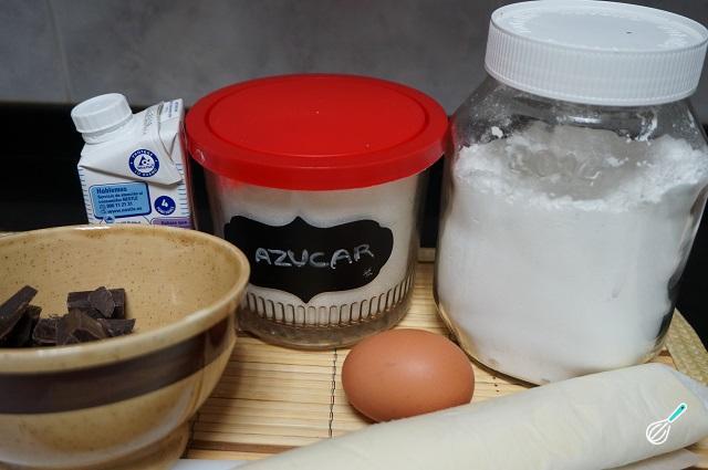 Comece por reunir os ingredientes necessários ao preparo desta receita de massa folhada recheada com chocolate. Ligue o forno a 180ºC.
