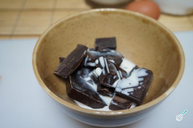 Coloque numa tigela o chocolate picado e o creme de leite. Leve para derreter no microondas durante 2 minutos na potência 600W. Retire, misture e, se o chocolate ainda não estiver todo derretido, derreta por mais 30-60 segundos.