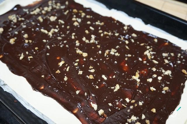 Em seguida abra a massa folhada e espalhe todo o chocolate nela, deixando algum espaço livre nas beiradas, como na fotografia. Em seguida polvilhe as nozes picadas.