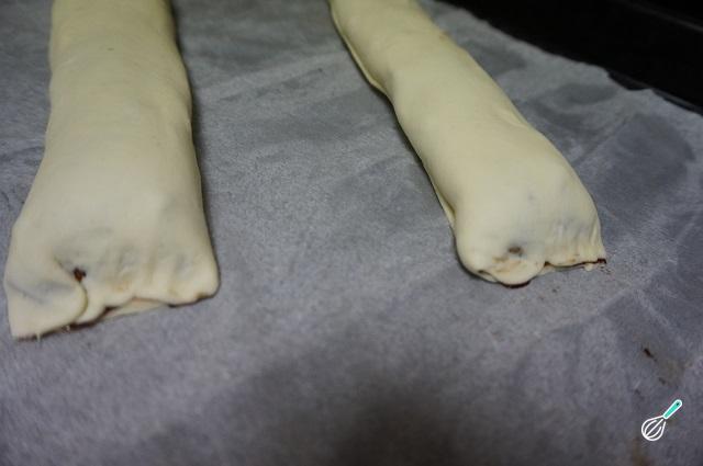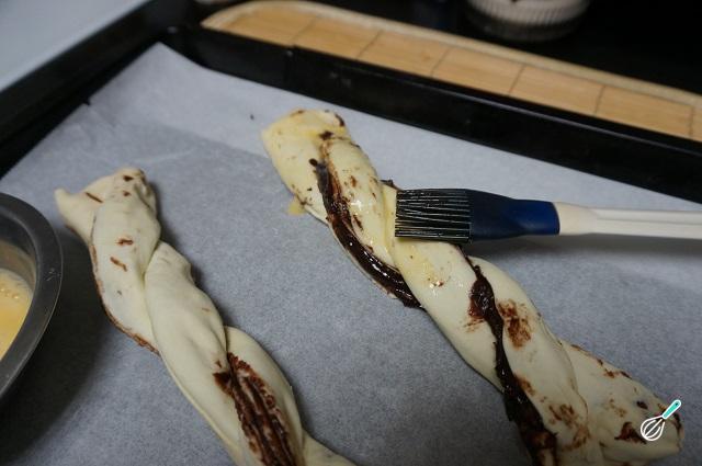 Por fim pincele as tranças de chocolate com o ovo batido e leve a assar no forno pré-aquecido a 180ºC por 20-30 minutos ou até dourar.