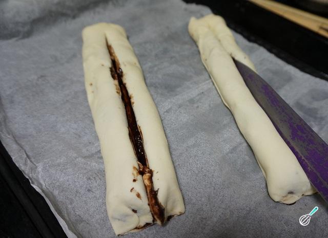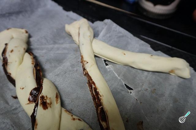 Em seguida enrole as duas metades como mostramos na fotografia, para conseguir um efeito de trança de chocolate.