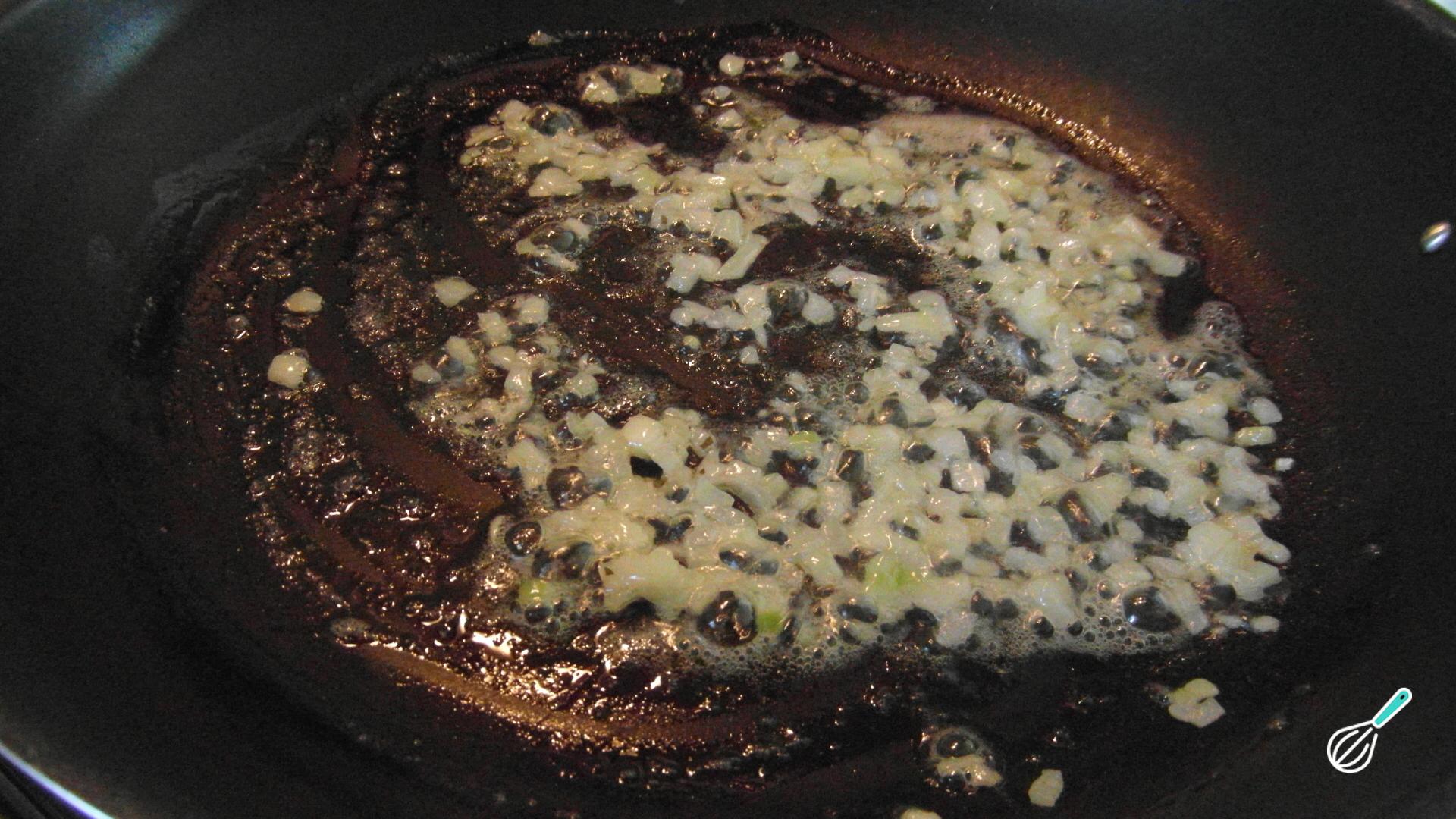 Derreta a manteiga numa frigideira e refogue a cebola e os alhos picados, até que a cebola fique transparente.