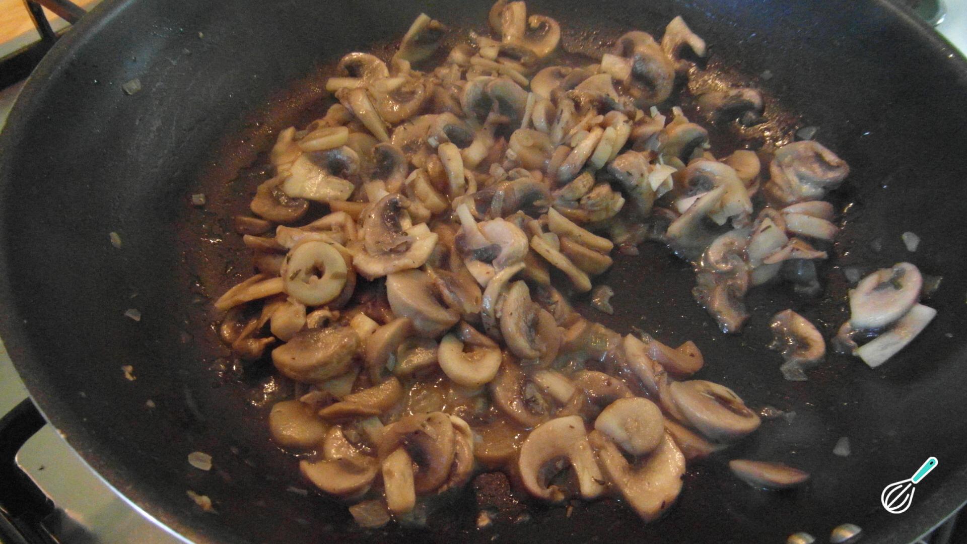 Acrescente os cogumelos laminados, tempere com tomilho, sal e pimenta a gosto, e salteie somente por 1 minuto. Desligue e deixe esfriar um pouco.