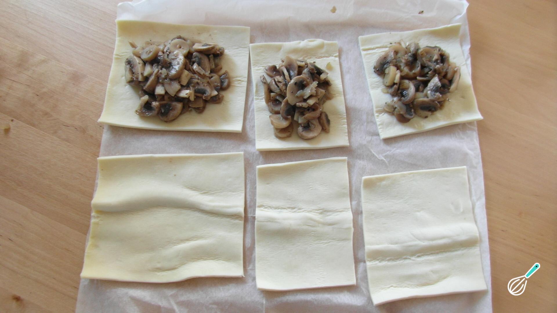 Abra a massa folhada e corte em quadrados. Distribua os cogumelos ao centro de metade desses quadrados.