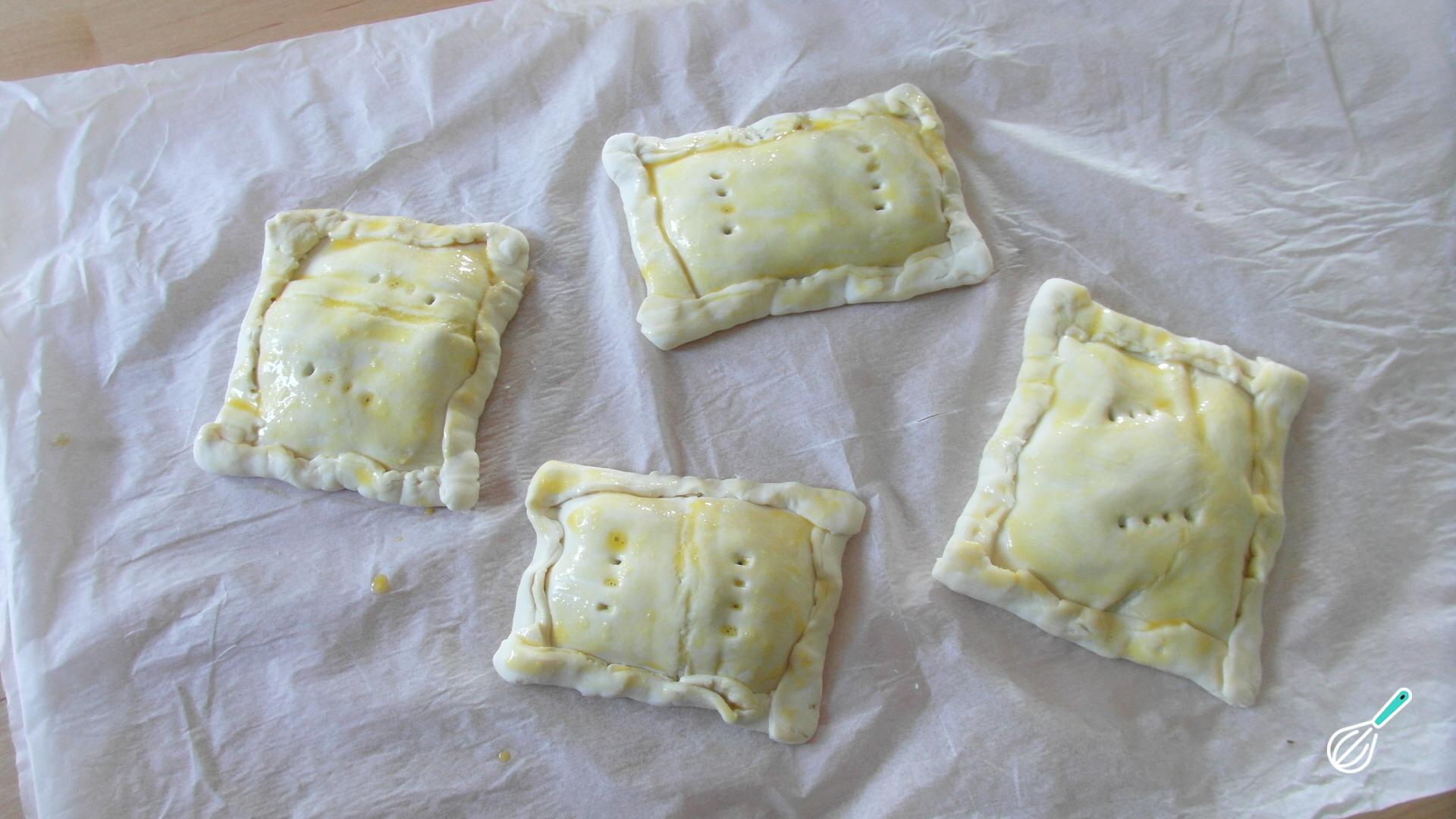 Tampe com os quadrados sem recheio e enrole as bordas, de forma a manter os cogumelos no interior. Pique os folhados com um garfo, para evitar que abram, e pincele com ovo batido.