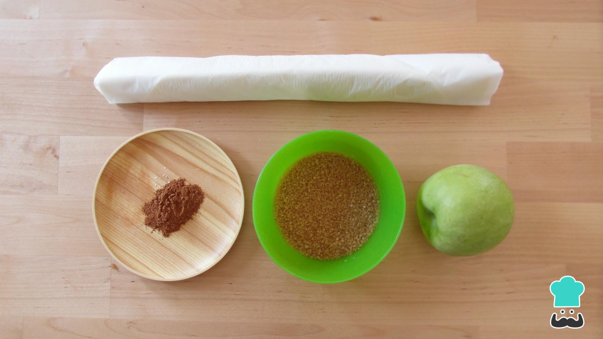 Para preparar este delicioso strudel de maçã e canela, comece por reunir os ingredientes necessários. As quantidade indicadas servem 4 folhados grandes, mas você pode fazer a receita render mais se fizer folhados menores.
