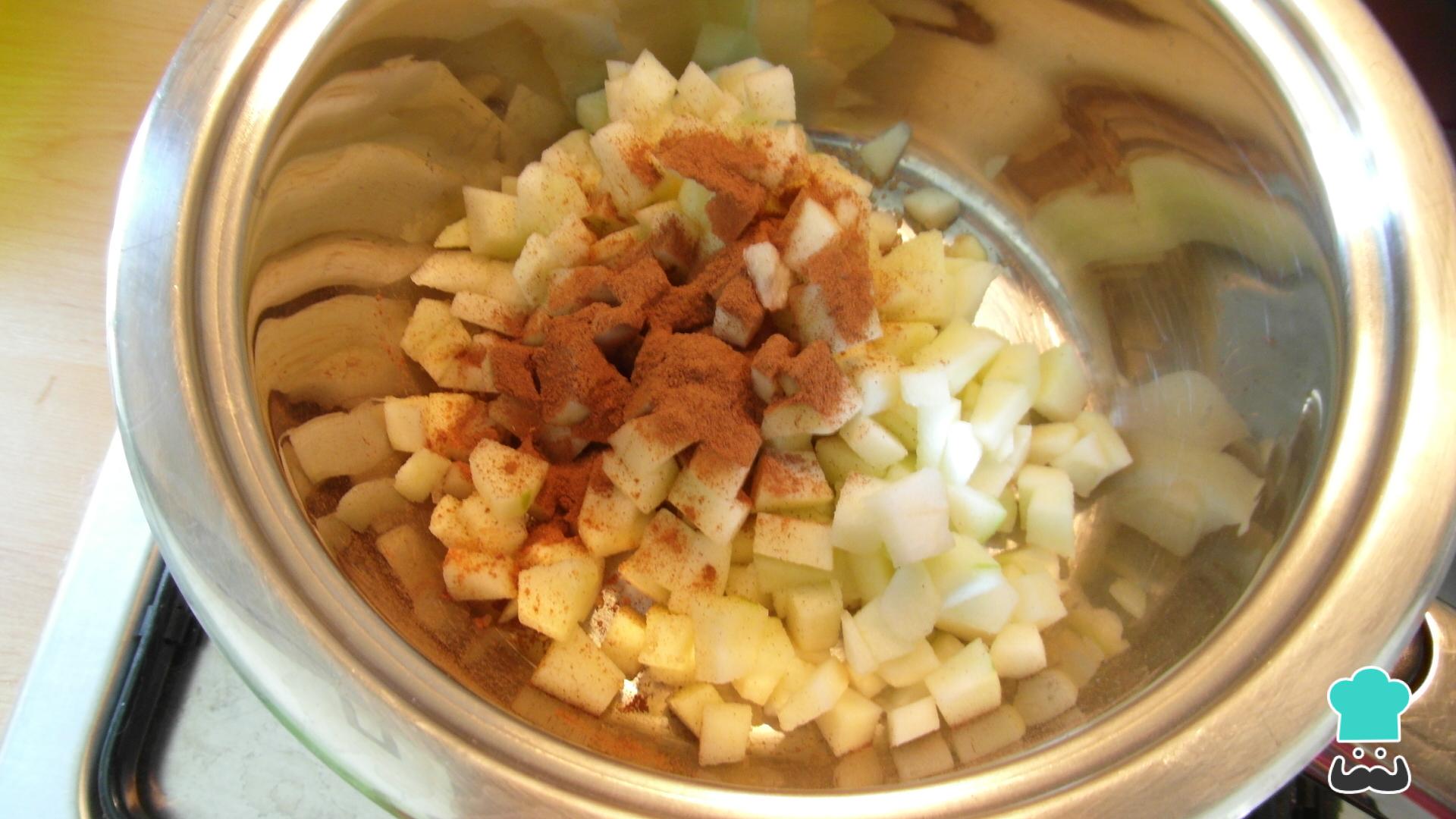 Lave, descasque e corte as maçãs em cubos pequenos. Leve ao fogo médio-baixo junto com a canela e o açúcar.