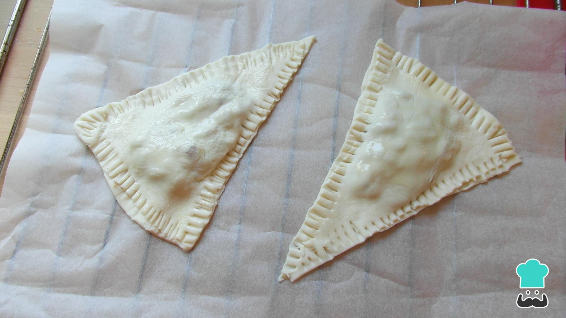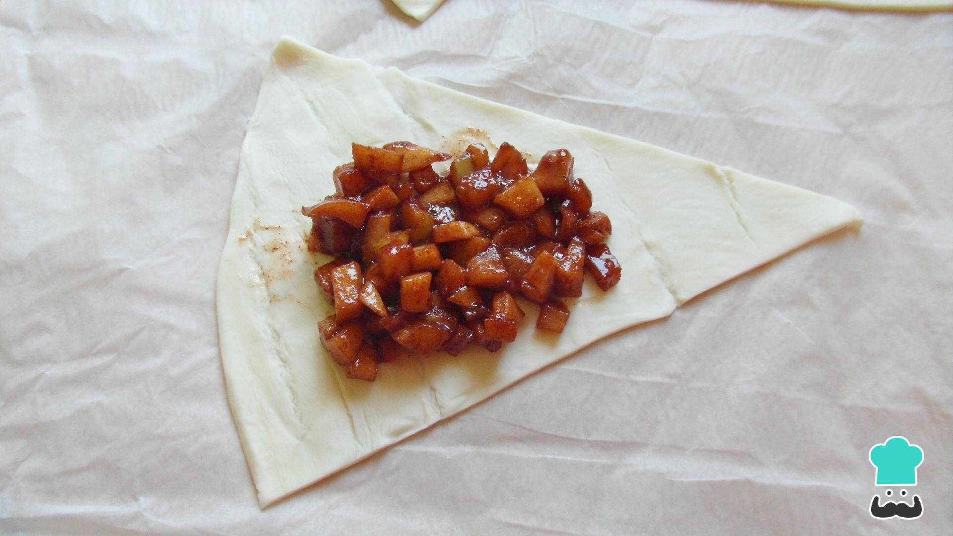 Corte peças de massa folhada com o formato que preferir, e em número par. Coloque ao centro um pouco do recheio.