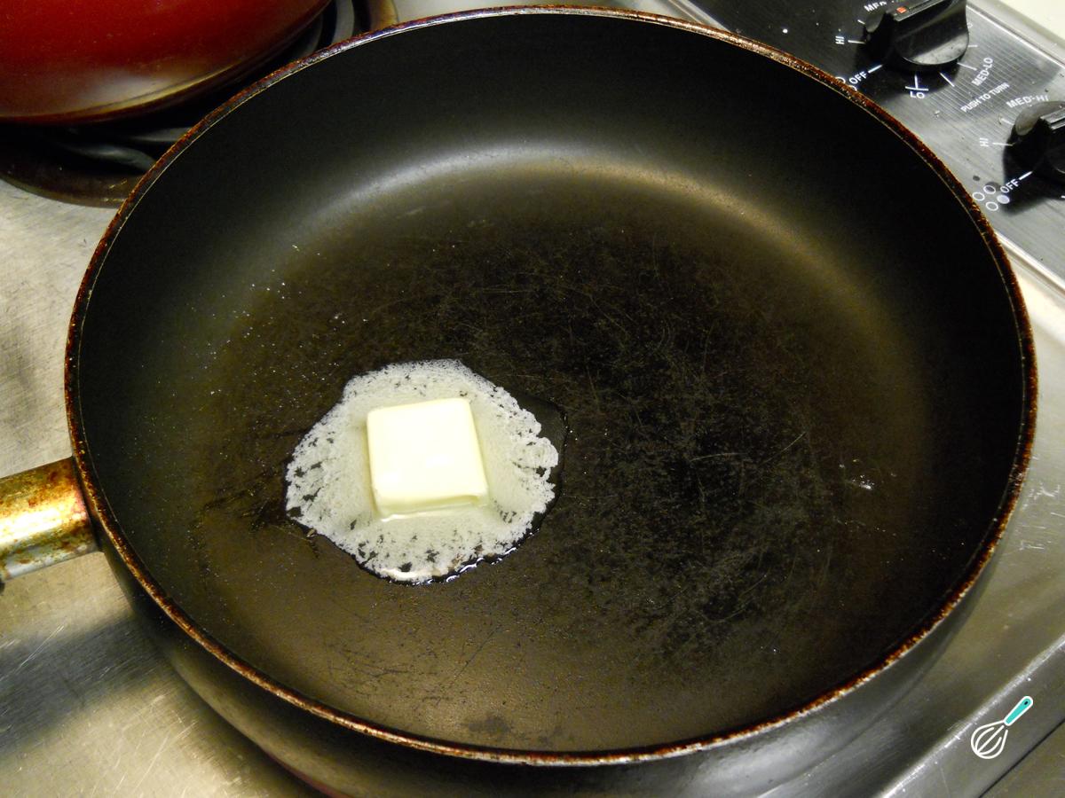 Para fazer um folhado de maçã fácil, comece por derreter a manteiga em uma frigideira antiaderente bem quente.