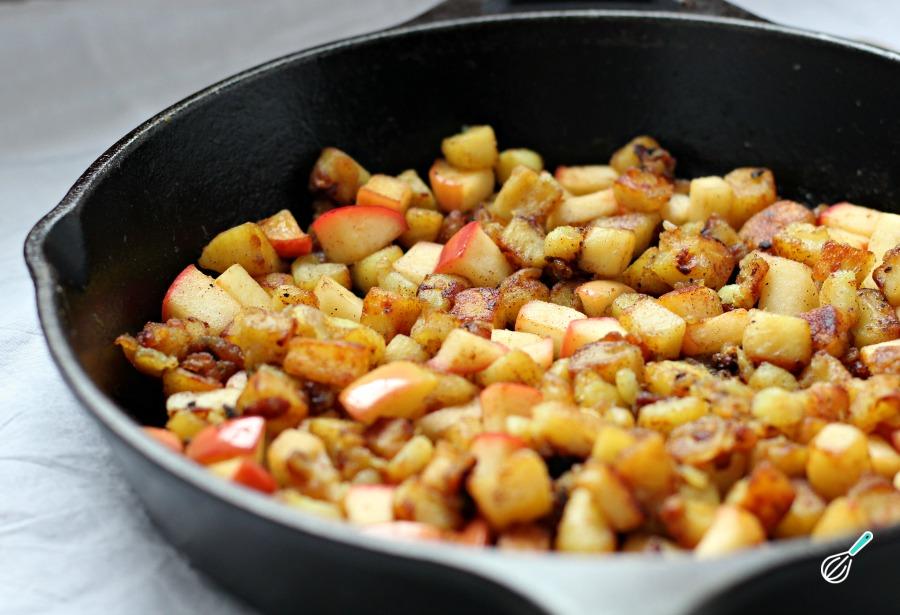 Junte a maçã picada e deixe refogar levemente. De seguida, junte o açúcar e a canela e mexa até caramelizar. Desligue o forno e reserve.