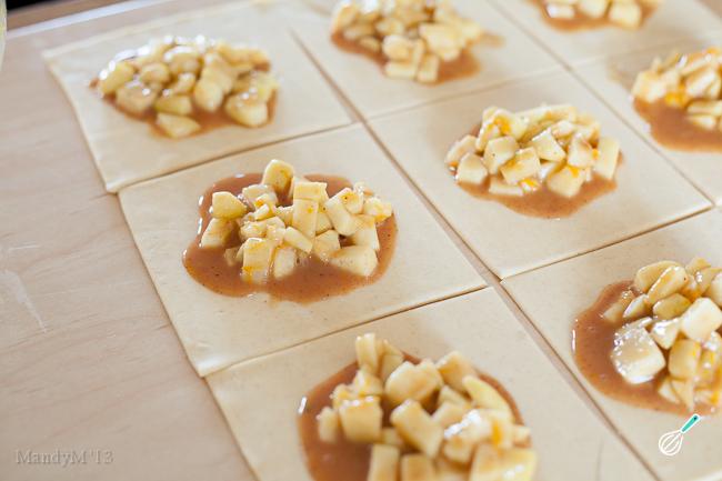 Depois de esfriar, coloque a maçã caramelizada picada no centro de um quadrado de massa folhada. Cubra com outro pedaço de massa folhada da mesma dimensão e sele as pontas para não soltar recheio. Pincele com a gema de ovo e coloque no freezer por meia hora.