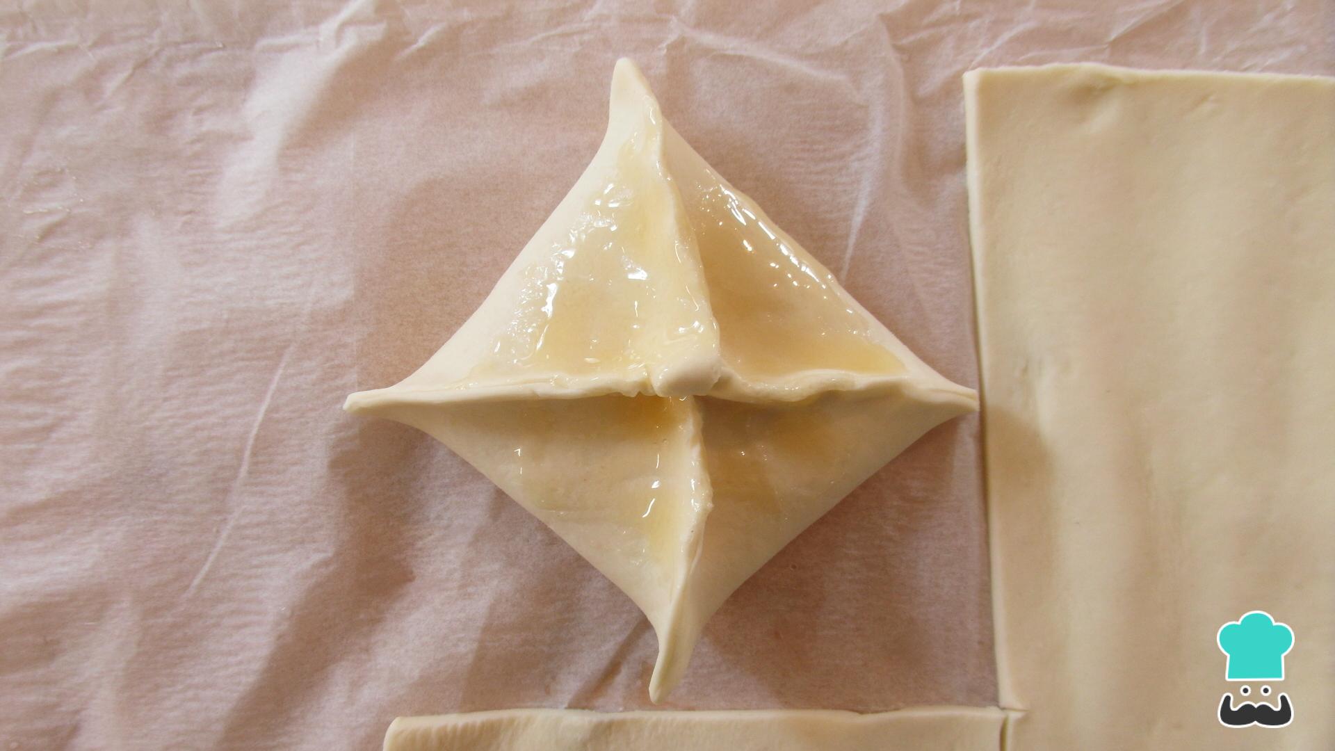 Umedeça as beiradas com um pouco de água e feche o folhado de queijo a unindo as pontas, como na fotografia. Pressione bem, para se certificar de que fica fechado, e pincele um pouco de mel. Coloque numa assadeira untada com um pouco de óleo ou manteiga.