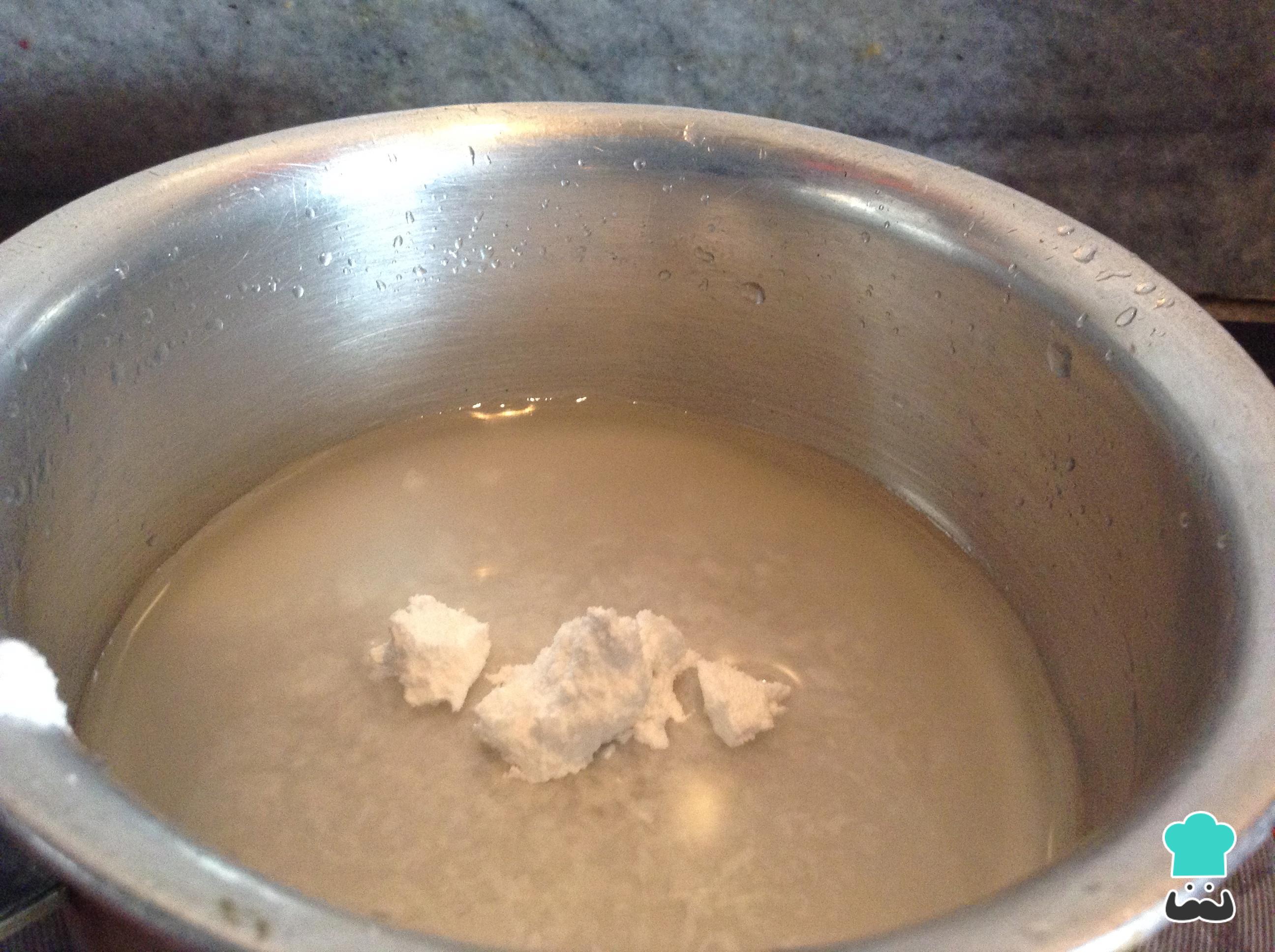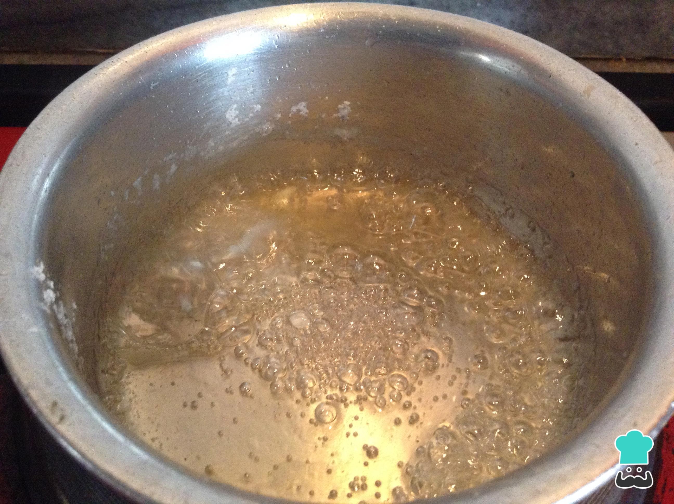 Este é o aspeto da calda de fondant caseiro para bolo ao atingir uma temperatura de 114-115ºC, aproximadamente. Se você não tiver um termômetro de cozinha, saiba que quando essa temperatura é atingida, a calda começa formando bolhas grossas. Desligue o fogo.