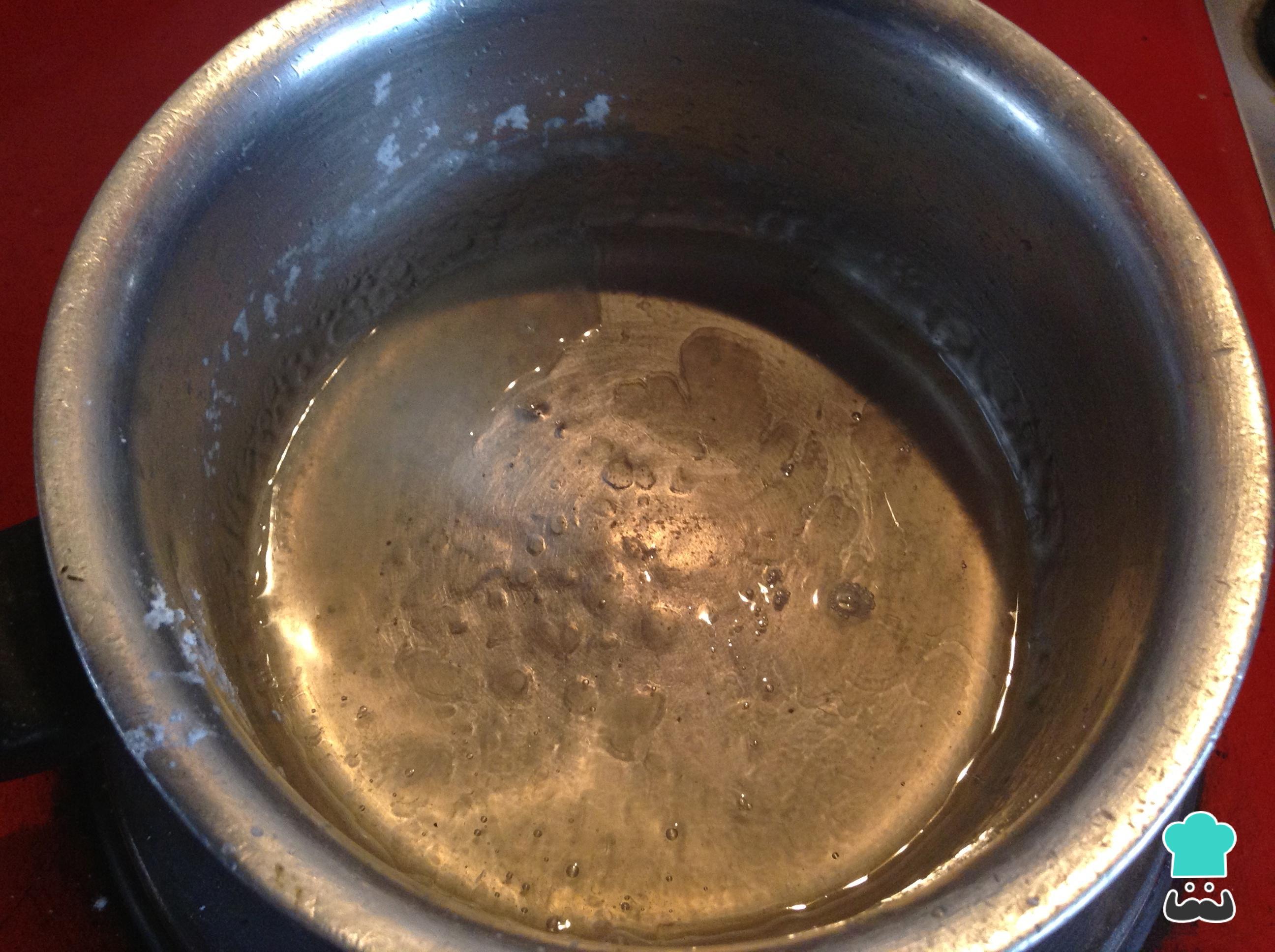 Numa panela, misture o açúcar com a água e leve ao fogo médio.