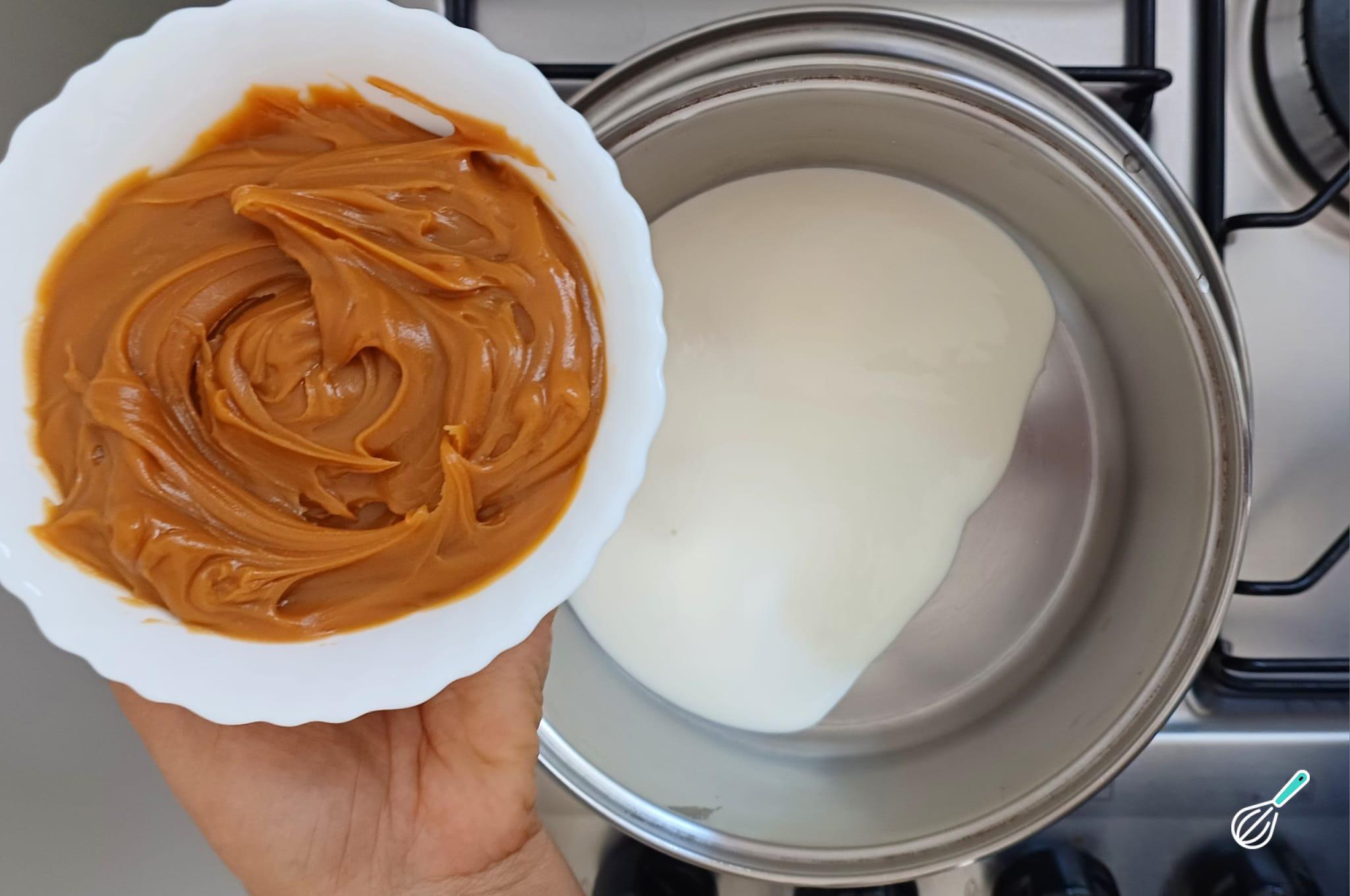 Numa panela, adicione o creme de leite e o doce de leite, misturando bem.