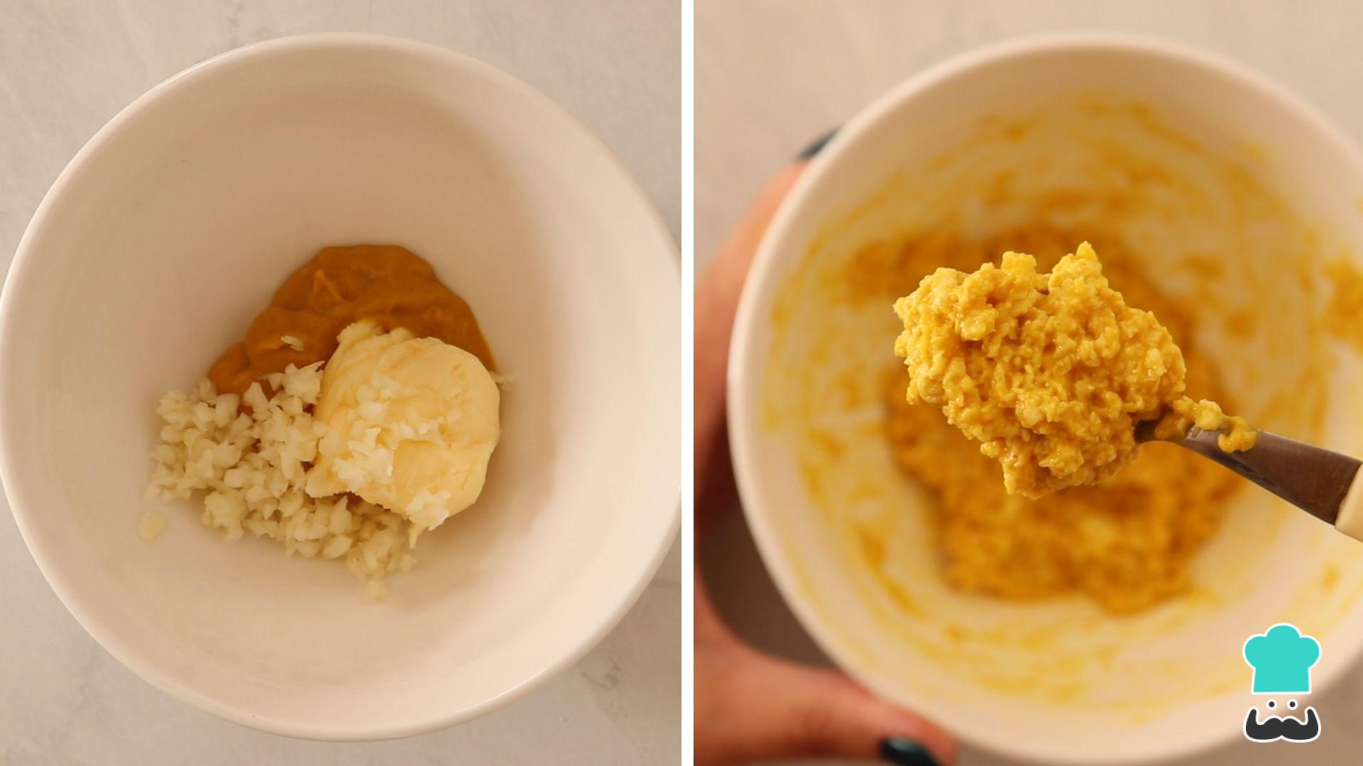 Em uma tigelinha coloque a mostarda, a manteiga e o alho e misture bem.