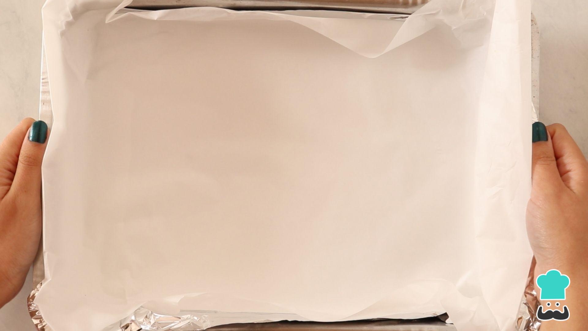 Forre uma assadeira com papel alumínio e papel manteiga, como na foto.