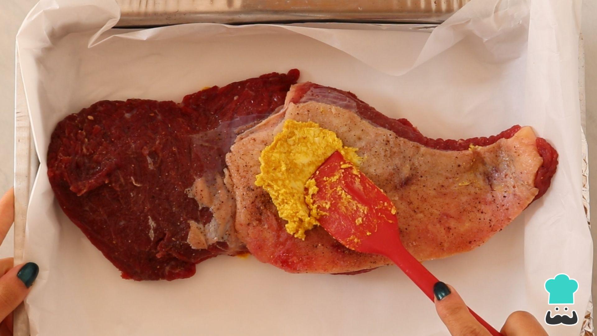 Transfira a carne para a assadeira e passe o tempero de mostarda, alho e manteiga preparado anteriormente, espalhando bem por toda a peça.