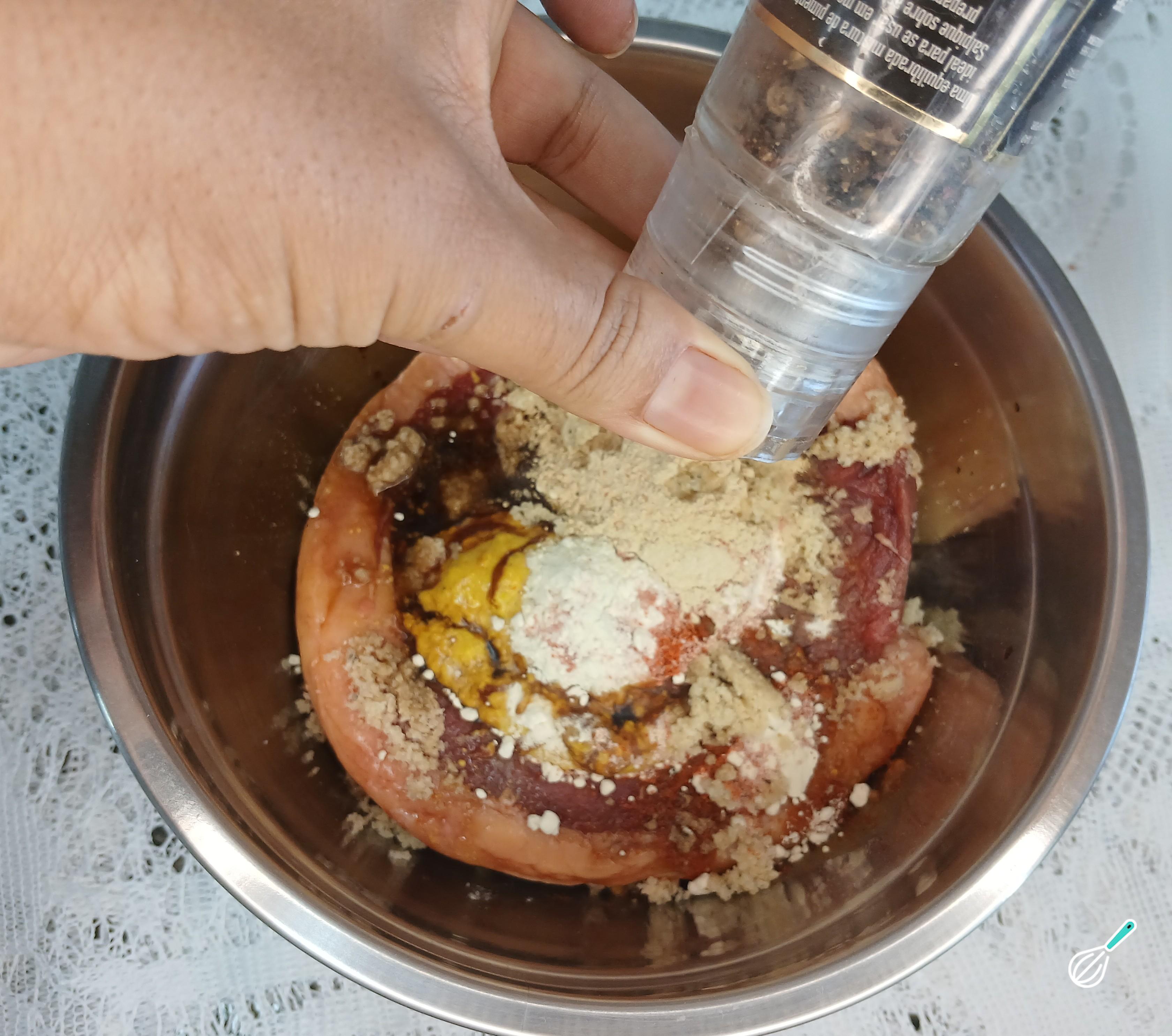 Feito isso, faça furos na carne e coloque-a em um bowl. Adicione o sal, os temperos, a pimenta, a mostarda amarela, o molho barbecue e o molho inglês.