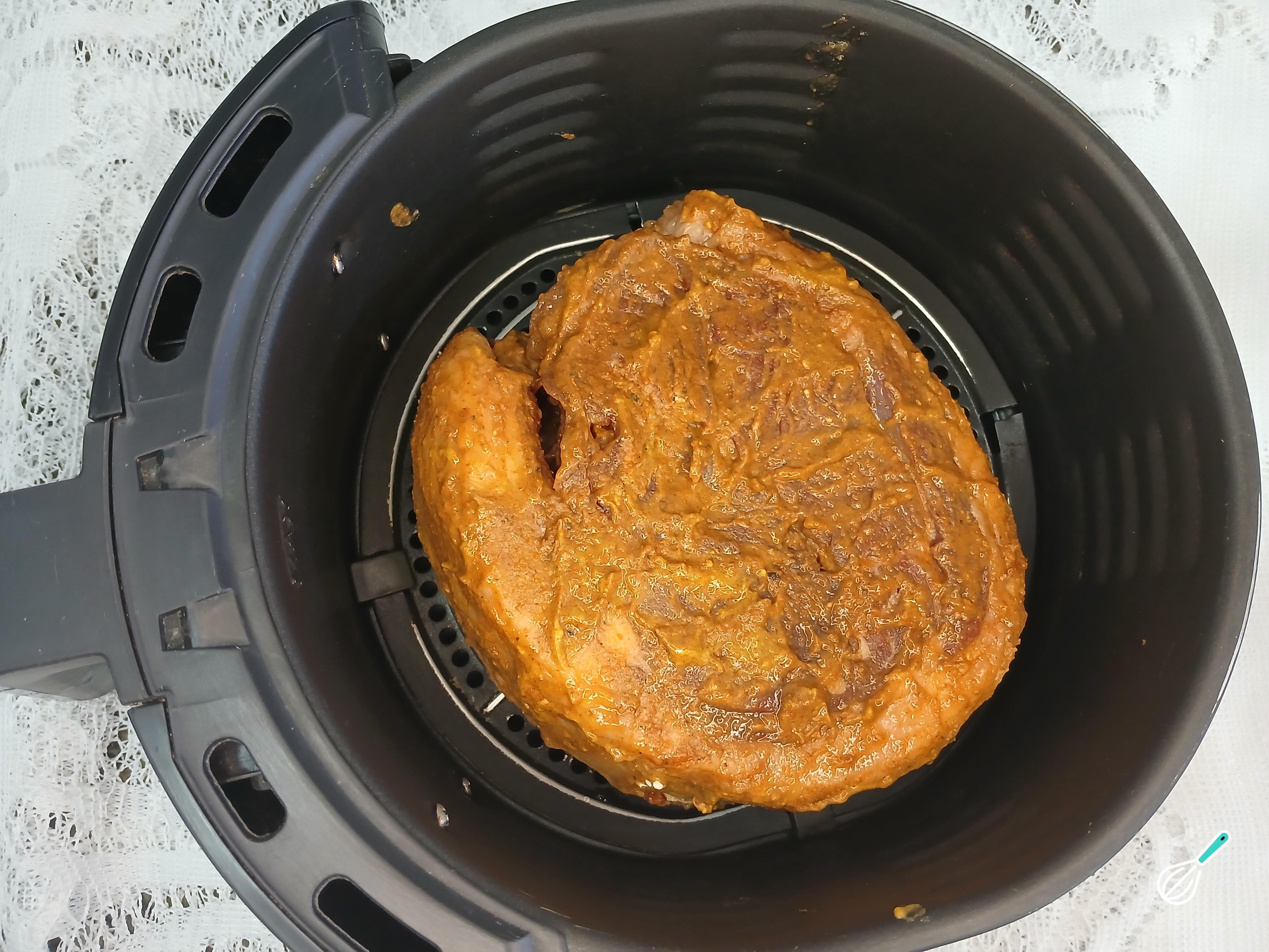 Retire da geladeira e coloque a carne para assar na air fryer. Deixe assar por uns 40 minutos em temperatura de 160 graus, assim evitará que queime por fora e não asse por dentro. Depois desse tempo, desligue a air fryer e retire a carne.