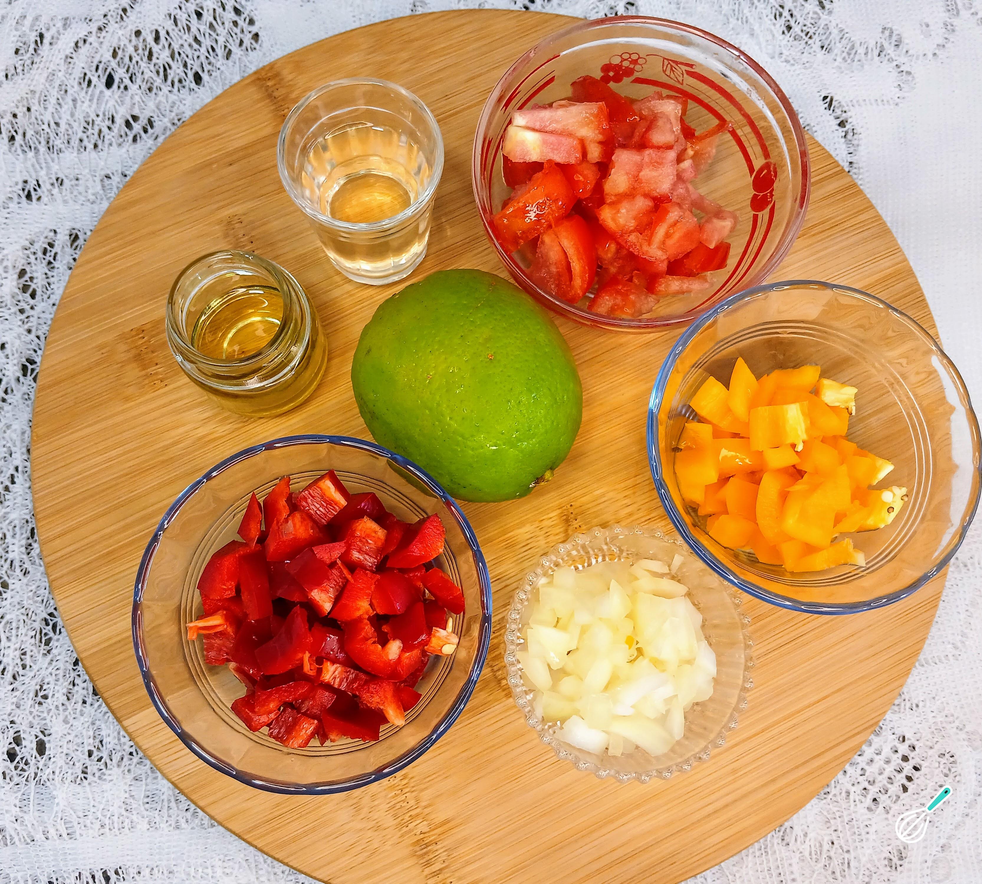 Separe os ingredientes para o preparo do vinagrete para acompanhar. Separe e corte em cubos pequenos o tomate e os pimentões. Corte também a cebola branca em cubos. Separe o limão, o azeite e o vinagre. Separe o sal.