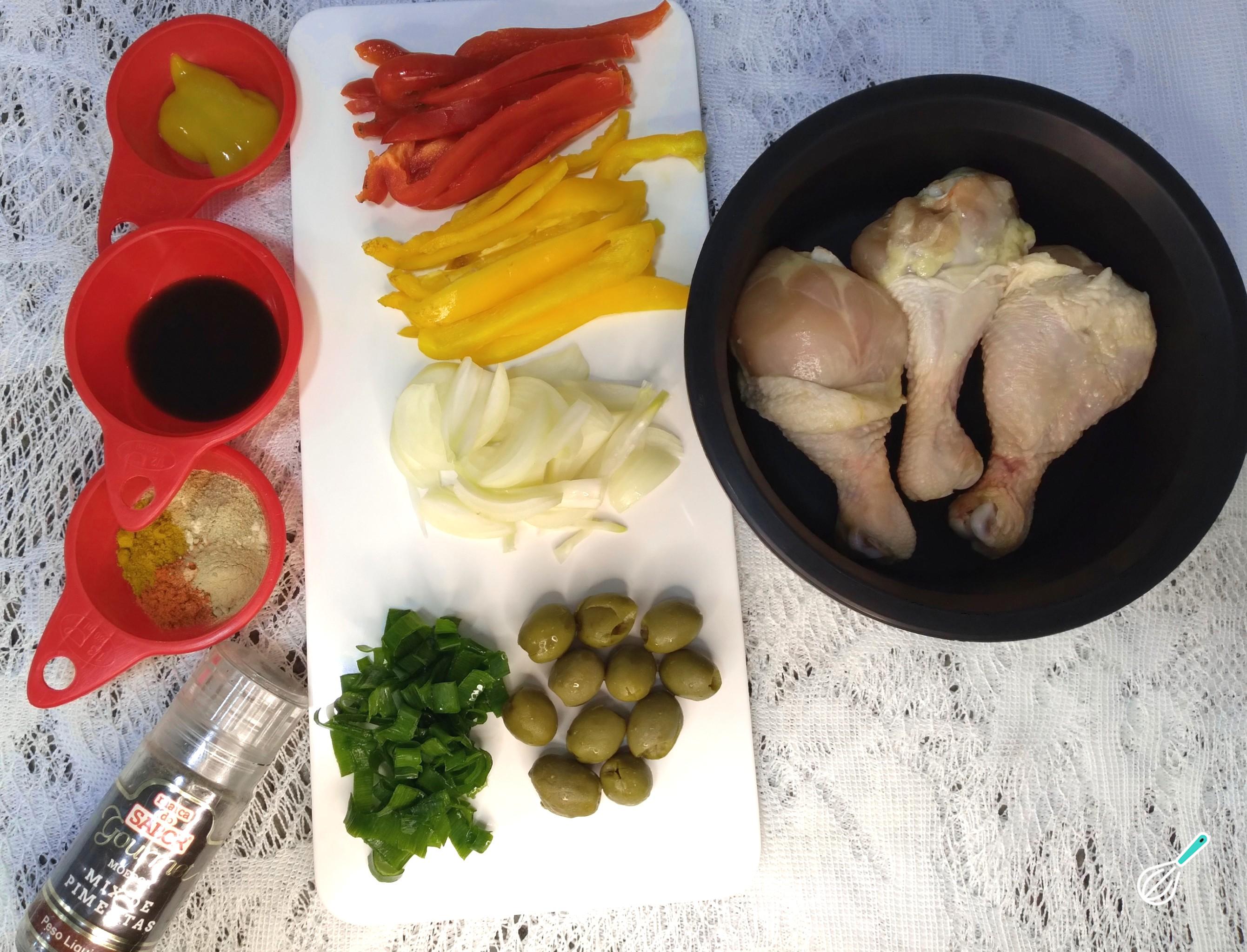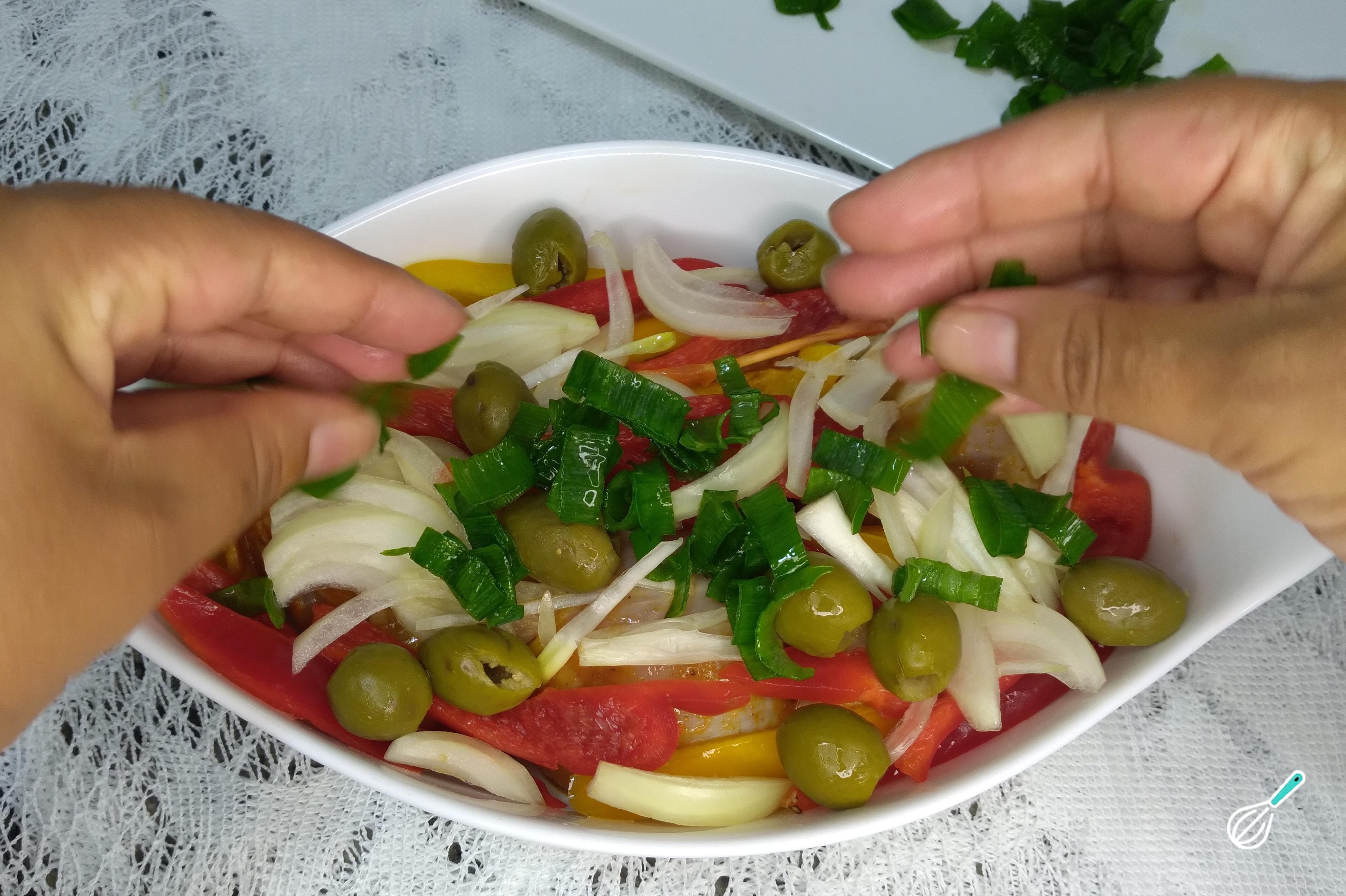 Comece separando os ingredientes. Corte a cebola em formato de meia lua, a cebolinha em rodelas não muito finas. Deixe as azeitonas inteiras, mas utilize azeitonas sem o caroço. Corte os pimentões vermelho e amarelo em tiras. Separe e meça a mostarda e o molho inglês.