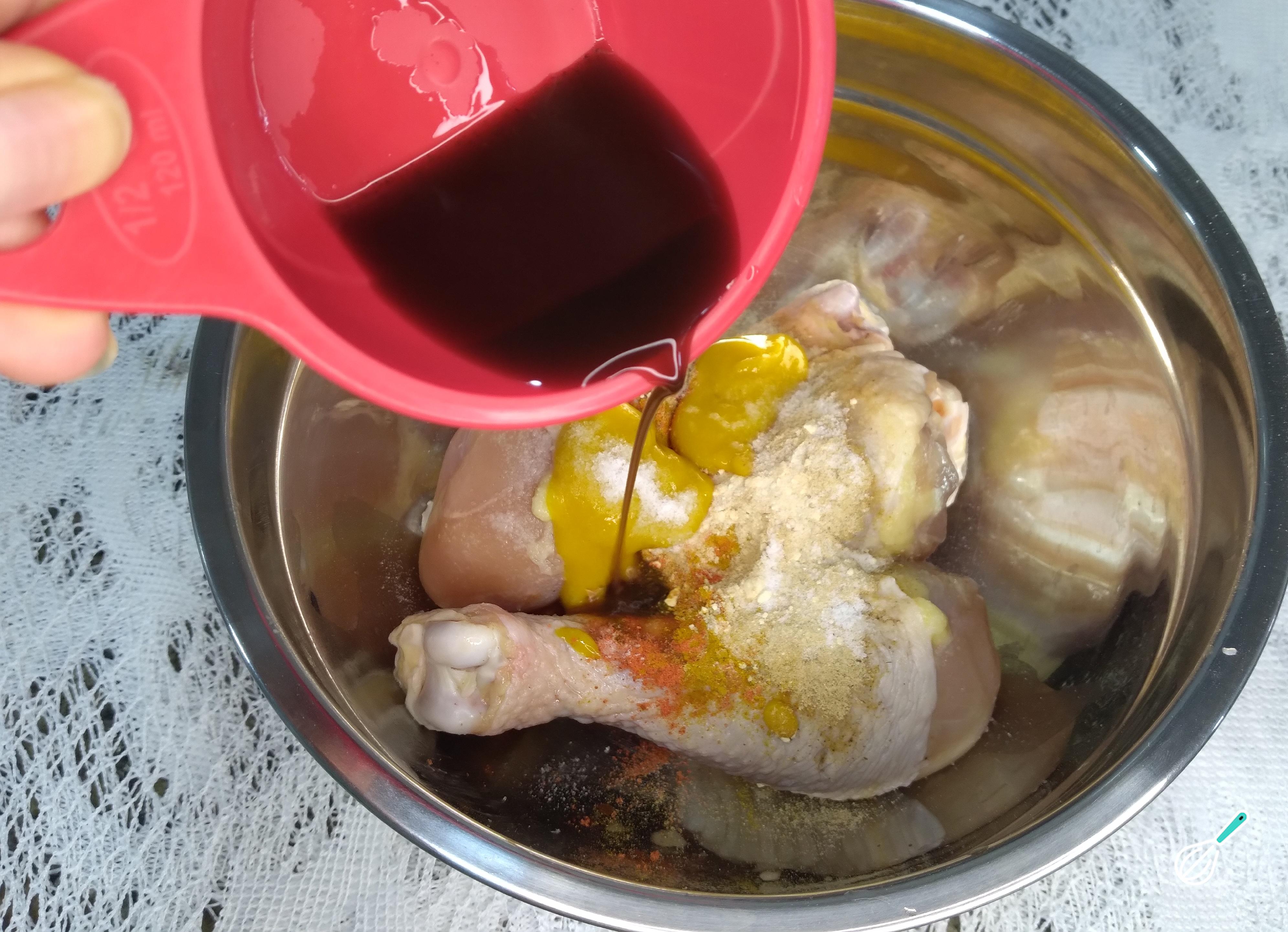 Feito isso, coloque o frango no vinagre de maçã por 5 minutos. Em seguida escorra. Em um bowl coloque as coxas de frango e adicione os temperos. Coloque o sal, os temperos de sua preferência, a mostarda e o molho inglês. Misture tudo com as mãos para absorver bem os sabores.