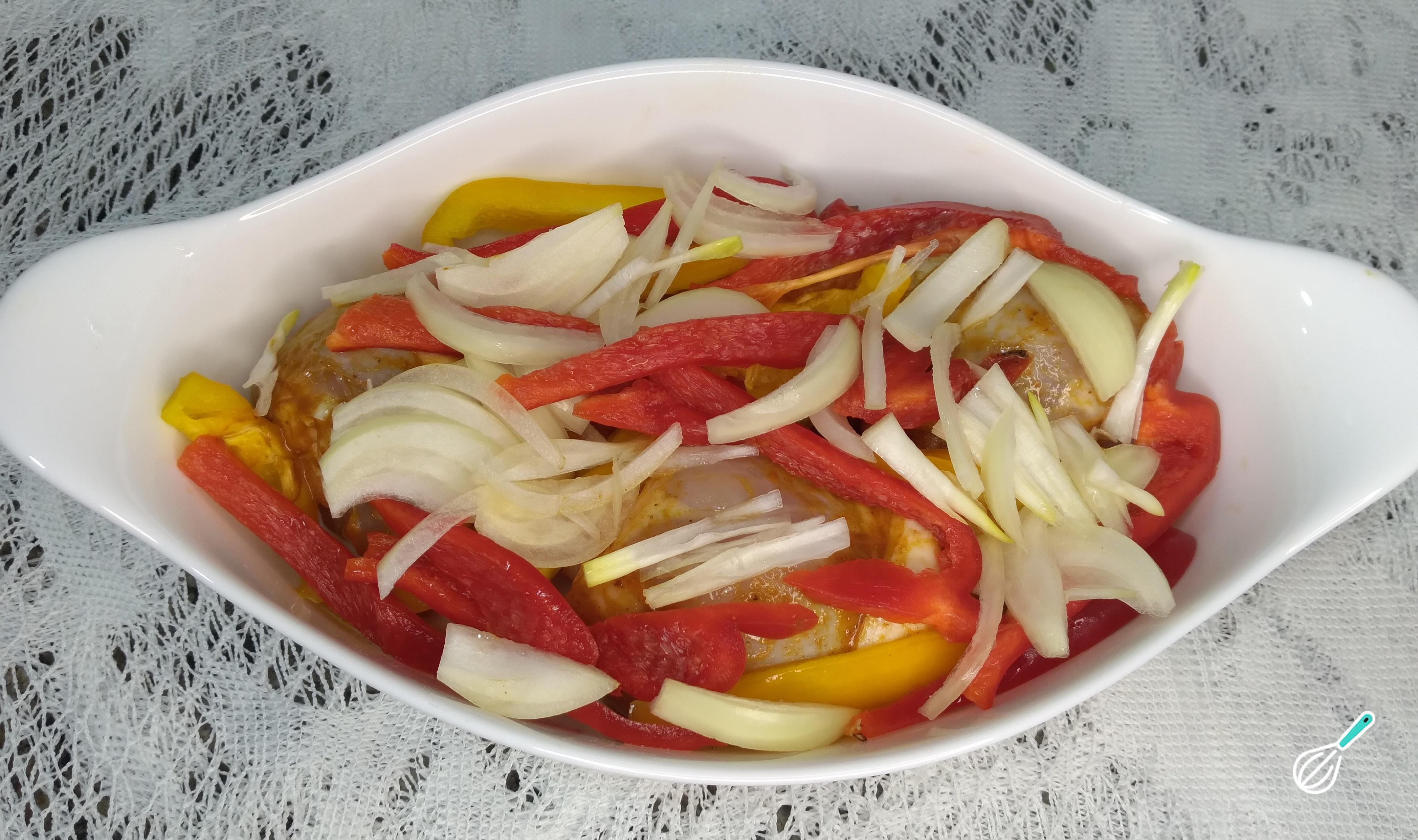 Em uma assadeira ou tabuleiro, coloque o frango temperado, regue com um pouco de azeite. Em seguida acrescente os pimentões vermelho e o amarelo. Acrescente também a cebola branca.