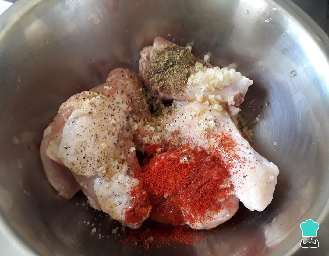 Comece preparando o frango à passarinho retirando os excessos de pele do frango e temperando com os ingredientes mencionados. Deixe descansar por 15 minutos, para pegar o sabor.