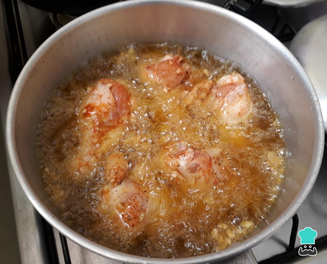 Como fritar frango à passarinho? Ajeite as coxinhas já temperadas na panela com o óleo quente, abaixe o fogo e tampe a panela. Deixe fritando por 15 minutos sem mexer. O segredo para obter um frango bem crocante e sequinho é deixar cozinhar lentamente sem mexer.