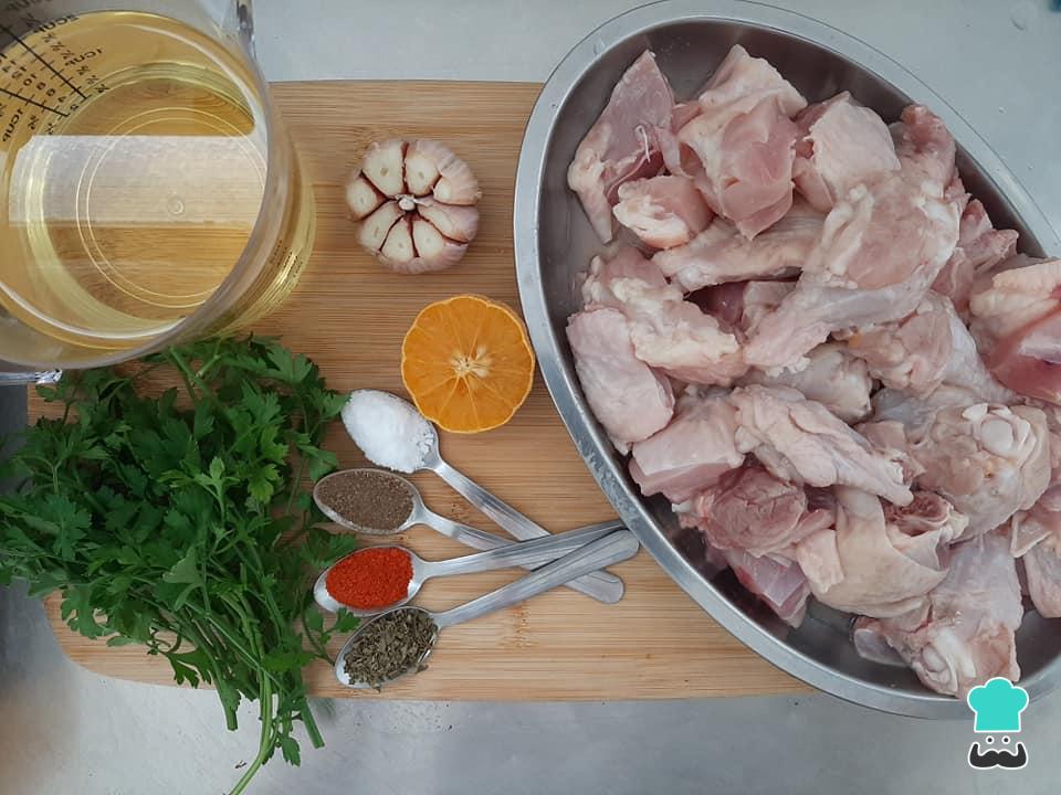 Separe os ingredientes necessários para preparar a receita. Utilize cortes pequenos de frango como asinhas, sobrecoxas em pedaços pequenos, coxinhas da asa para que fritem mais rapidamente e sejam mais fáceis de servir como aperitivo. Limpe os pedaços de frango passando limão sobre eles. Amasse bem os dentes de alho para temperar o frango.