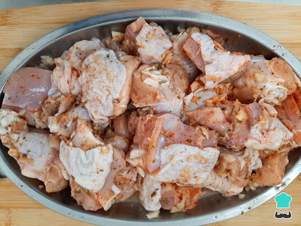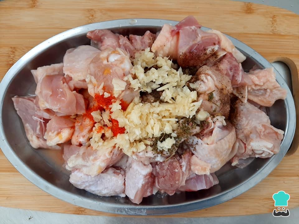 Tempere os pedacinhos de frango com o sal, o alho amassado, a pimenta do reino, a páprica, as ervas finas ou a salsa desidratada e misture bem.