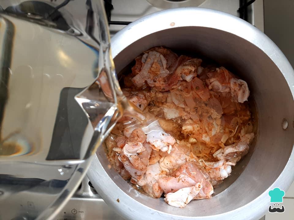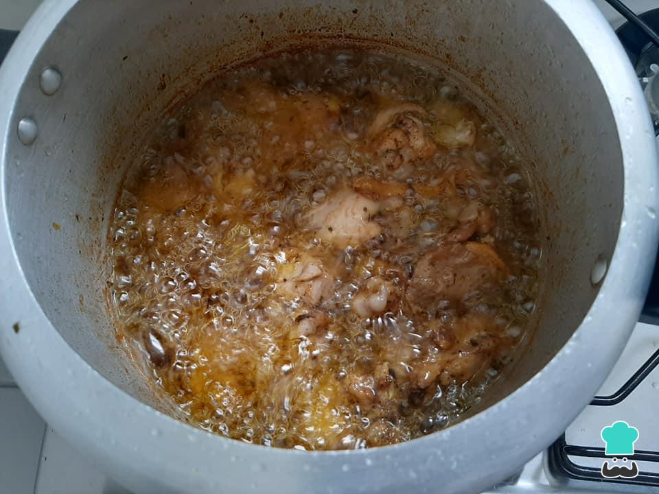 Desligue o fogo e deixe a pressão sair completamente para abrir a panela. Deixe a panela destampada, ligue o fogo novamente e termine de fritar os pedacinhos de frango até ficarem dourados.