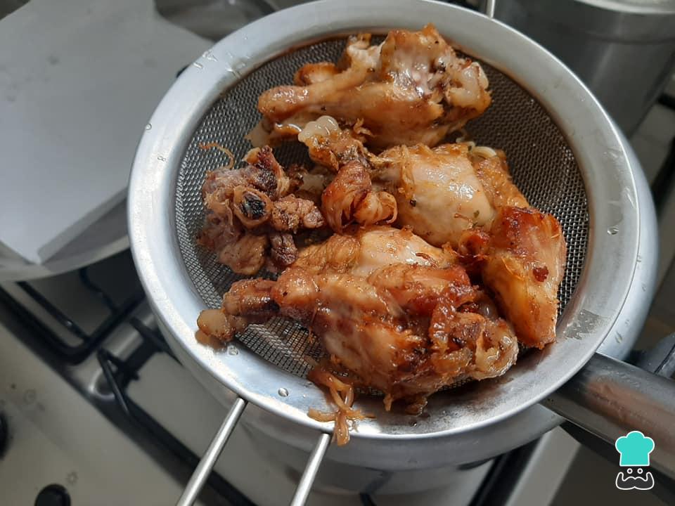 Quando os pedaços de frango à passarinho estiverem dourados como mostra a foto abaixo, retire-os com uma escumadeira (para que o excesso de óleo escorra) e deixe-os sobre uma peneira para que fiquem sequinhos.