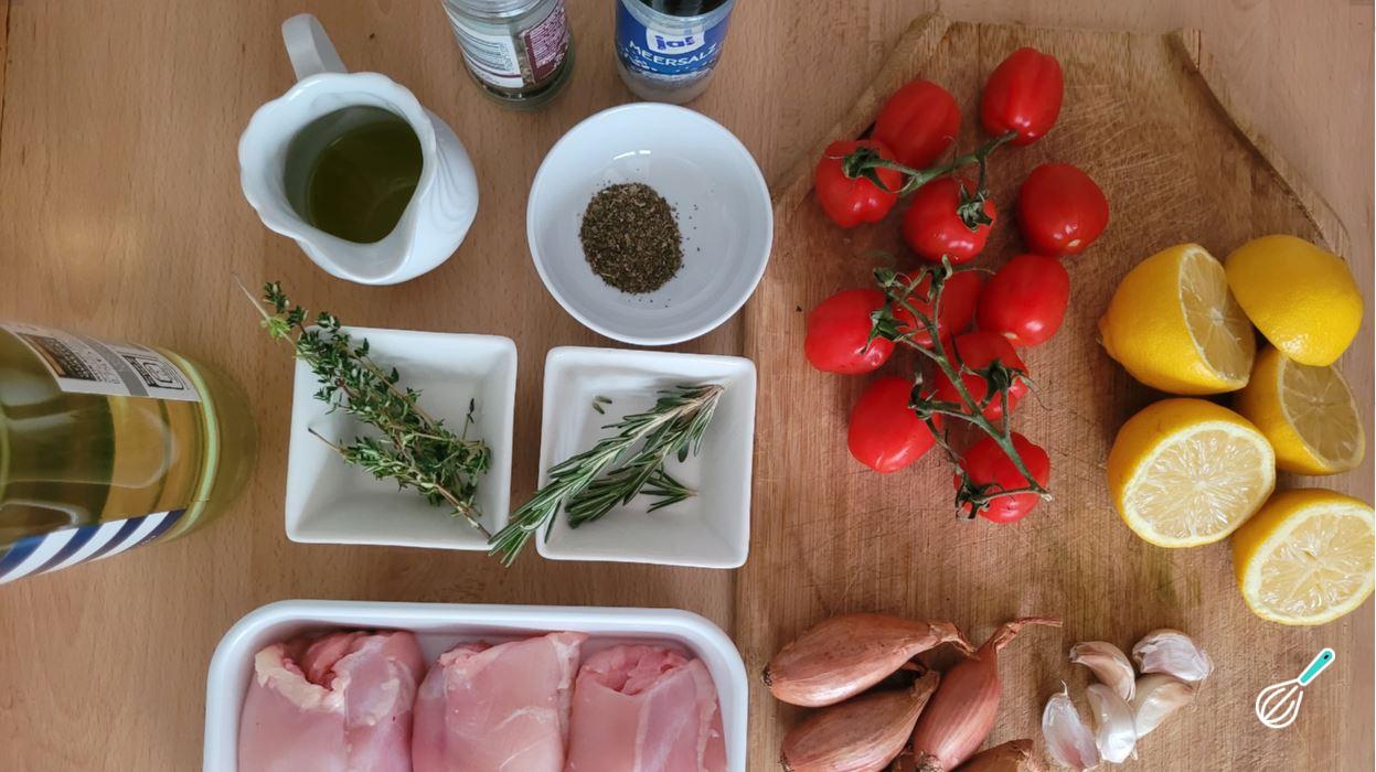 Separe os ingredientes para fazer seu frango à provençal. Se não encontrar as chalotas, você pode substituir por cebola branca ou roxa cortada em rodelas ou meias luas mais grossas. As sobrecoxas podem ser substituídas por coxa ou peito de frango. As ervas frescas dão um toque especial nessa receita, mas se preferir, pode substituir por ervas desidratadas. O limão siciliano tem um sabor bem mais suave que o limão tahiti. Se preferir usar o tahiti, ao invés de colocar o limão cortado no forno, prefira apenas regar com umas gotinhas de limão para finalizar. As quantidades de tomate, cebola e alho são apenas uma referência. Você pode alterar de acordo com o seu paladar.