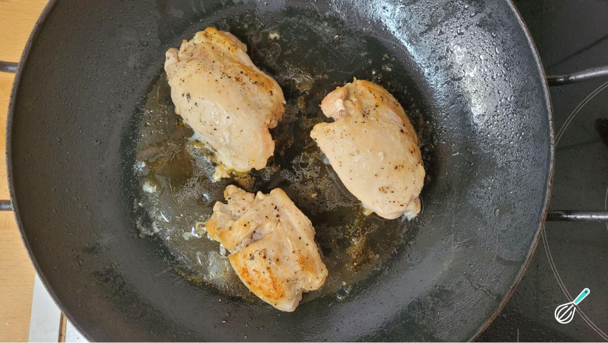 Em uma frigideira que possa ir ao forno, leve as sobrecoxas inteiras para dourar em uma frigideira com azeite, já temperando com sal e pimenta do reino. Deixa dourar dos dois lados. Elas não precisam estar totalmente cozidas, pois vão finalizar o cozimento no forno.
