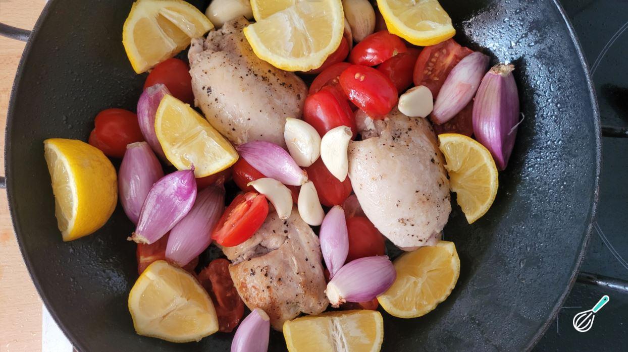 Se você não tiver uma frigideira que possa ir ao forno, transfira as sobrecoxas douradas para uma assadeira. Corte os limões em fatias do tamanho que preferir. Adicione os tomates inteiros, as chalotas e os dentes de alho descascados e inteiros.