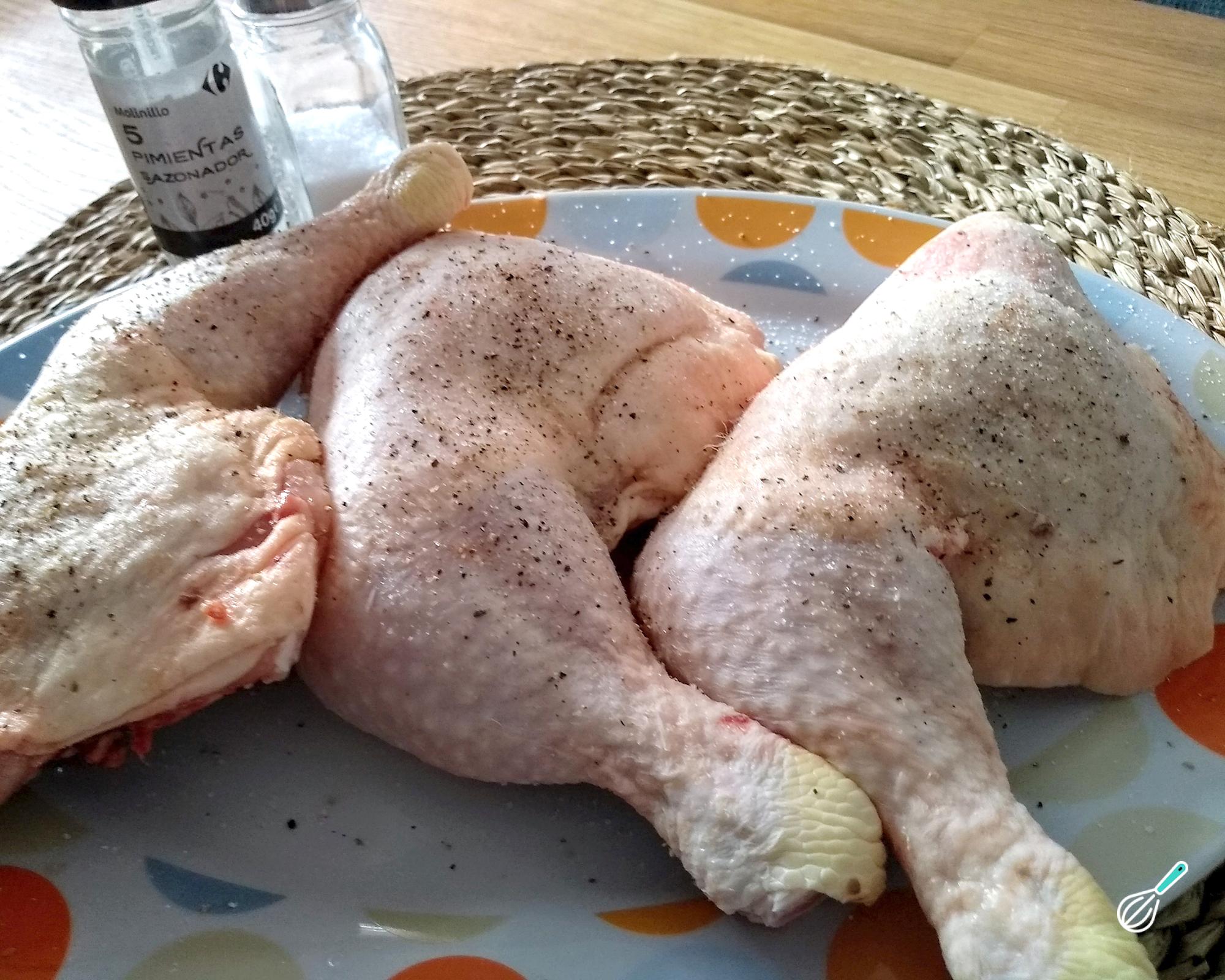 Para preparar esse frango ao forno simples comece por temperar o frango com sal e pimenta do reino a gosto. Neste caso estamos usando coxa e sobrecoxa de frango, mas você pode usar qualquer peça de frango que quiser e até frango inteiro.