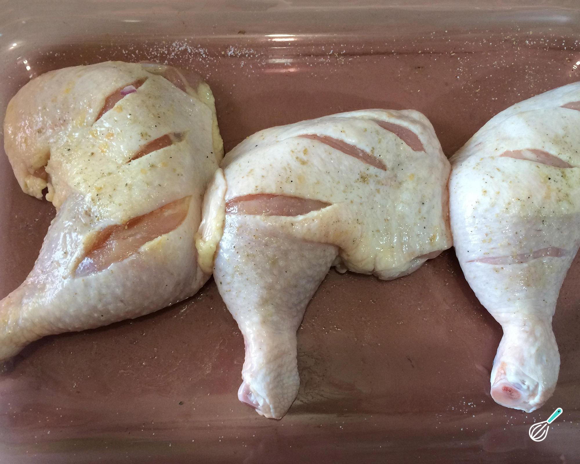 Dica: Não é necessário mover nem dar a volta ao frango na hora de temperar. A ordem de temperos não é importante.