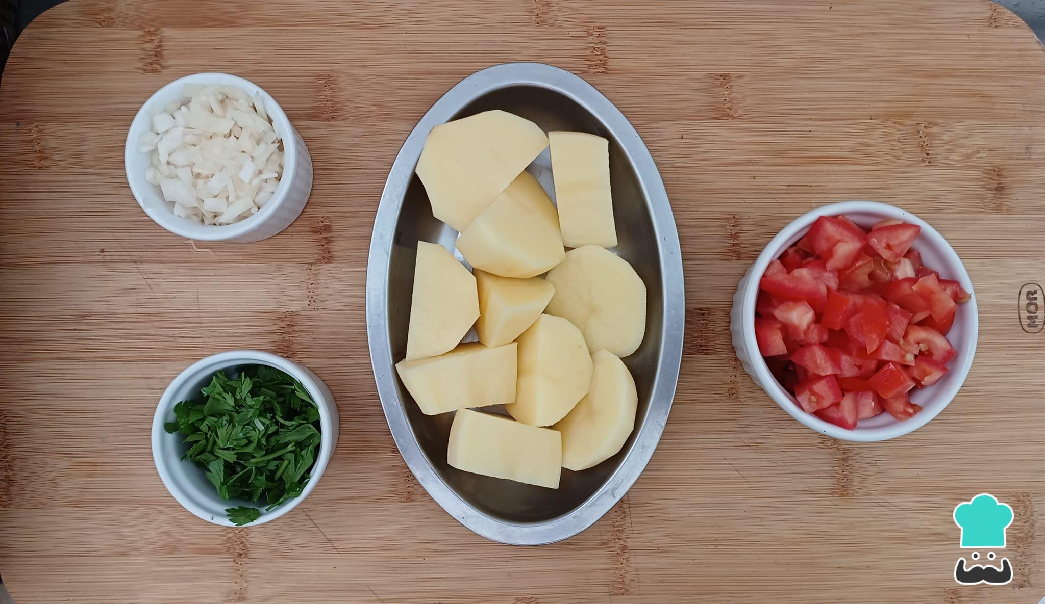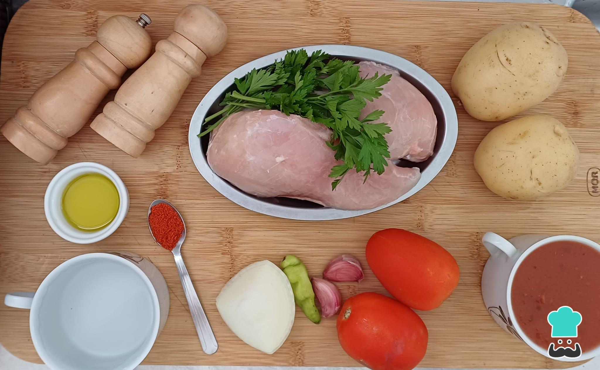 Separe todos os ingredientes necessários para preparar essa receita de frango ao molho com batatas.
