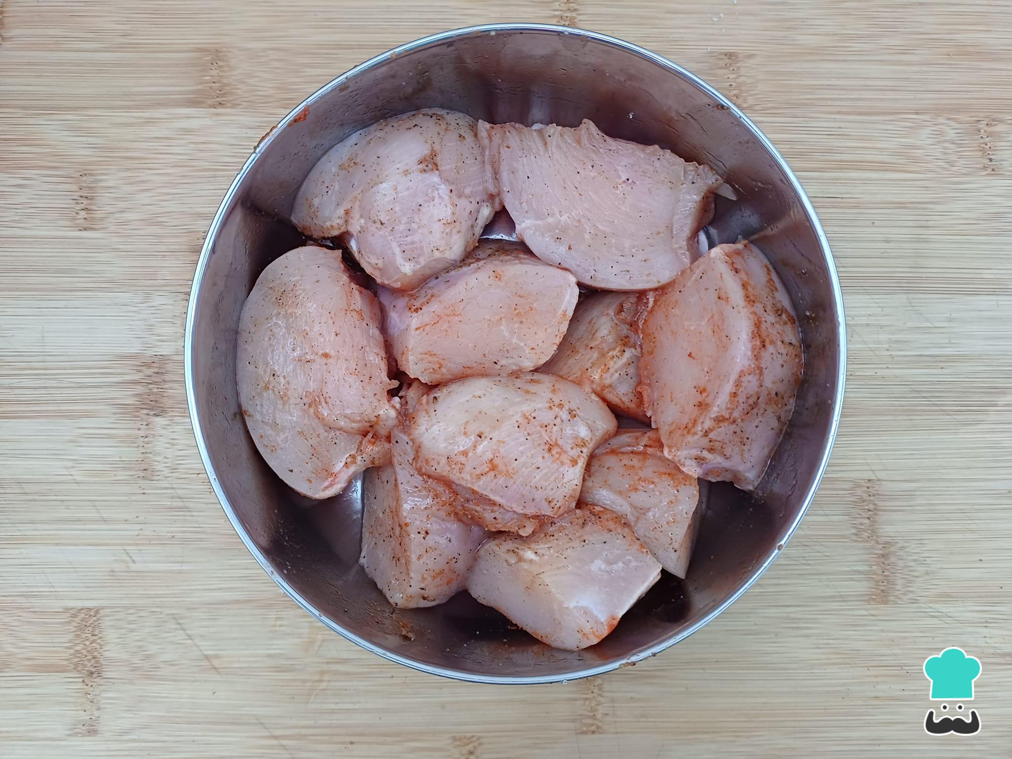 Corte o peito de frango em pedaços médios e tempere-os com sal, pimenta-do-reino e páprica picante. Deixe neste tempero por 30 minutos.