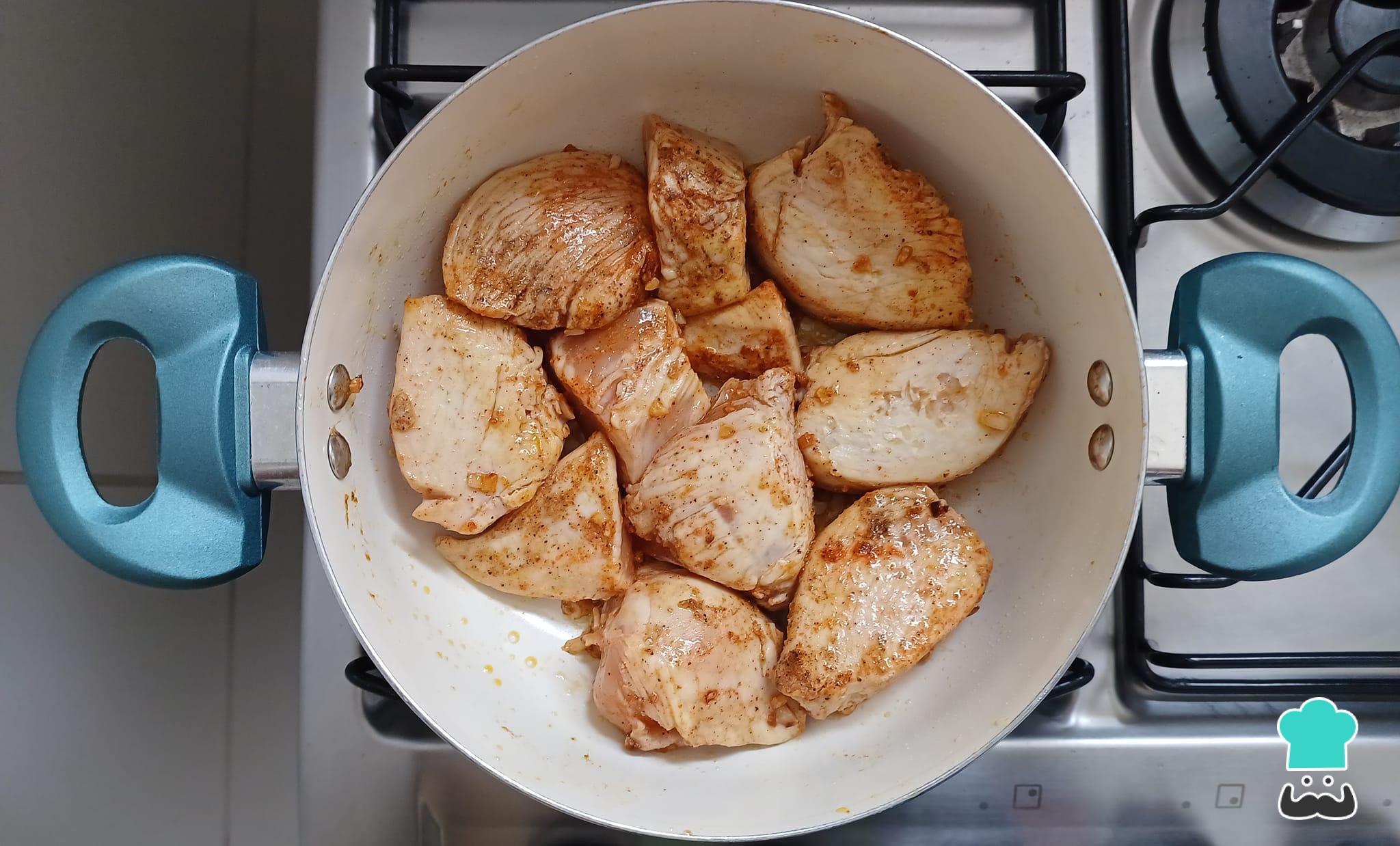 Em uma panela média, doure o alho no azeite de oliva e refogue o frango, deixando-os dourar por uns 10 minutos.